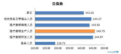 数据来源:中国医疗器械行业协会、医疗器械创新网 医疗器械生产人员总信心指数最高,而医务人员最低 数据显示,不同职业受访者对中国医疗器械行业信心指数均较高,医疗器械生产人员信心指数最高,高达145.75。而医务人员最低,仅为128.72。