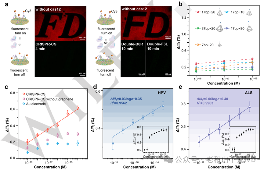 图2 CRISPR-CS的性能验证及与其他系统的比较 3. 报告分子的结构优化 研究团队利用荧光染料Cy3取代TDN悬臂上的MB,证实了CRISPR-CS系统的协同剪切效应增强了Cas12a对TDN悬臂的剪切效率。在靶标浓度为10-16 M时,CRISPR-CS系统在4 min内产生了显著的荧光猝灭,而Double-F3L和DoubleB6R系统需要约10 min完成(图3a)。由于报告基因的结构对CRISPR-CS系统的信号转导至关重要。研究团队设计了5种不同结构的TDN-MB报告基因,包括17 bp-10、17 bp-20、17 bp-30、7 bp-20和37 bp-20。框架过小会导至难以避免相邻悬臂的纠缠,而过大则会影响TDN-MB的信号传输。因此,17 bp-20的四面体结构,框架高度接近于悬臂长度,比其他高度过高或过低的悬臂更可控,且更接近石墨烯表面。在加入10−16 M 靶标后,具有17 bp-20结构的TDN-MB产生显著的信号响应,至少为其他四种结构的1.3倍(图3b)。此外,石墨烯的引入显著增强了TDN-MB的初始信号,使CRISPR-CS系统在检测相同浓度的靶标时能够产生更强的ΔI/I0响应(图3c)。为验证CRISPR-CS系统的多功能性,研究团队将其应用于检测人乳头瘤病毒(HPV)及肌萎缩侧索硬化症(ALS),LoD分别为1´10-18 M及1´10-17 M,且均展现出了良好的线性范围,证实了CRISPR-CS系统的高通用性。