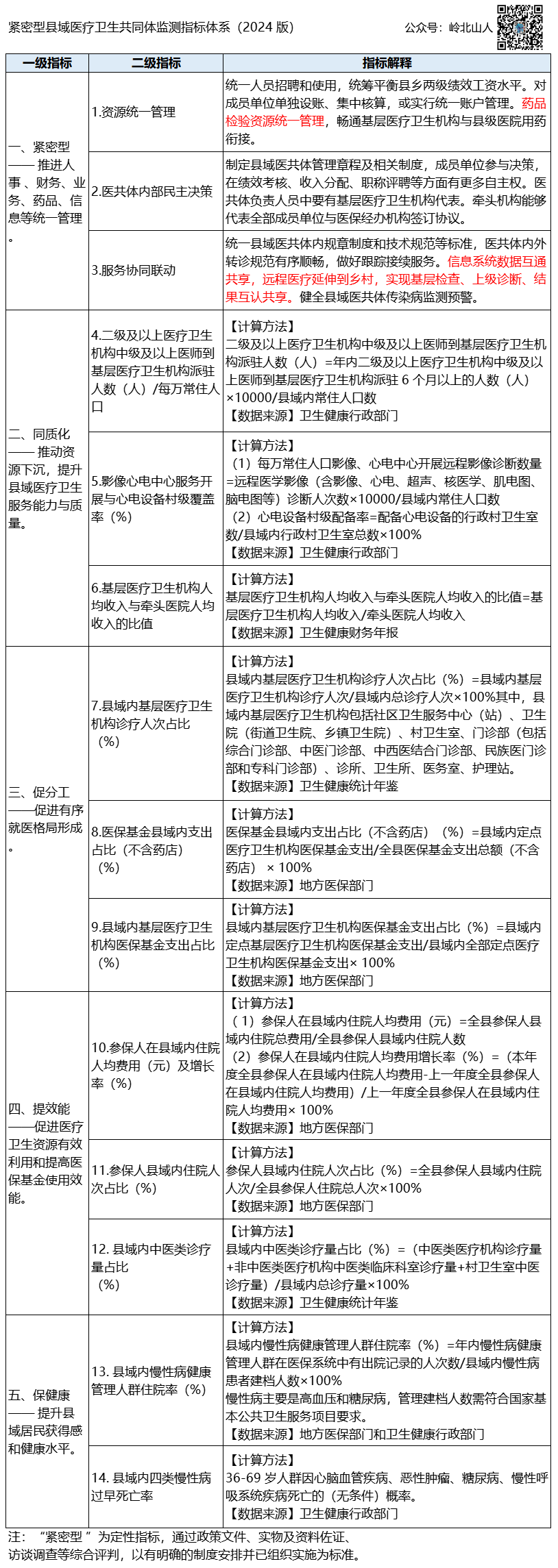 各省、自治区、直辖市及新疆生产建设兵团卫生健康委、医保局、中医药局、疾控局:为深入推进紧密型县域医疗卫生共同体(以下简称县域医共体)建设,促进资源下沉,提升县域和基层服务能力,根据中共中央办公厅、国务院办公厅《关于进一步深化改革促进乡村医疗卫生体系健康发展的意见》《关于进一步完善医疗卫生服务体系的意见》和国家卫生健康委等10部门《关于全面推进紧密型县域医疗卫生共同体建设的指导意见》(国卫基层发〔2023〕41号),国家卫生健康委、国家医保局、国家中医药局、国家疾控局制定了县域医共体监测指标体系,现印发给你们。指标体系供县级开展自评和省市两级开展监测评价,国家对各省份建设情况进行动态监测。各地要加强工作指导,强化结果运用,确保县域医共体建设扎实推进,取得实效。2019年,国家卫生健康委在全国开展紧密型县域医共体建设试点。2020年,国家卫生健康委、国家医保局、国家中医药局制定印发《紧密型县域医疗卫生共同体建设评判标准和监测指标体系(试行)》,通过连续三年组织开展监测评价,有效提高了地方对建设紧密型县域医共体的重视程度和工作力度,推动了县域医共体建设稳健发展。2023年12月,经国务院同意,国家卫生健康委等10部门联合印发《关于全面推进紧密型县域医疗卫生共同体建设的指导意见》,将紧密型县域医共体建设由试点转向全面推进,并制定了全面推进的时间表、路线图,对县域医共体建设外部管理、内部运行、完善服务、支持政策等做出了明确规定。截至目前,全国各省份基本实现以省为单位全面推开紧密型县域医共体的阶段目标。为及时总结和评判全面阶段的进展情况,国家卫生健康委组织制定了《紧密型县域医疗卫生共同体监测指标体系(2024版)》(以下简称《指标体系》),并印发《通知》。《指标体系》在试点阶段紧密型县域医共体评判标准和监测指标体系基础上,结合新的政策要求和前3年监测情况对评判标准和监测指标体系进行修订,重点体现人员、技术、服务、管理下沉基层导向和紧密型要求,供各地对照标准稳步推进紧密型县域医共体建设。同时,为落实中央为基层减负精神和要求,《指标体系》精简指标数量,进一步提高指标的针对性和敏感性,将评判标准和监测指标合并,总体指标数量减少到14条,其中定量指标11条,定性指标3条。《指标体系》围绕“紧密型、同质化、促分工、提效能、保健康”5个方面设置了14项指标。“紧密型”为定性指标,就是要推进人事、财务、业务、药品、信息等统一管理,通过政策文件、实物及资料佐证、访谈调查等综合评判,以有明确的制度安排并已组织实施为标准,包括资源统一管理、医共体内部民主决策、服务协同联动3项指标。“同质化”就是要推动资源下沉,提升县域医疗卫生服务能力与质量,包括二级及以上医疗卫生机构中级及以上医师到基层医疗卫生机构派驻人数(人)/每万常住人口、影像心电中心服务开展与心电设备村级覆盖率、基层医疗卫生机构人均收入与牵头医院人均收入的比值3项指标。“促分工”就是要促进有序就医格局形成,包括县域内基层医疗卫生机构诊疗人次数占比、医保基金县域内支出占比(不含药店)、县域内基层医疗卫生机构医保基金支出占比3项指标。“提效能”就是要促进医疗卫生资源有效利用和提高医保基金使用效能,包括参保人在县域内住院人均费用(元)及增长率、参保人县域内住院人次占比、县域内中医类诊疗量占比3项指标。“保健康”就是要提升县域居民获得感和健康水平,包括县域内慢性病健康管理人群住院率、县域内四类慢性病过早死亡率2项指标。《通知》强调,指标体系供县级开展自评和省市两级开展监测评价,国家对各省份建设情况进行动态监测。各地要加强工作指导,强化结果运用,确保县域医共体建设扎实推进,取得实效。