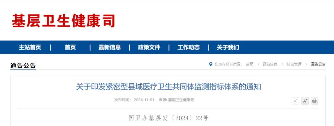 11月1日,国家卫生健康委办公厅、国家医保局办公室、国家中医药局综合司、国家疾控局综合司联合发布通知,关于印发紧密型县域医疗卫生共同体监测指标体系的通知。