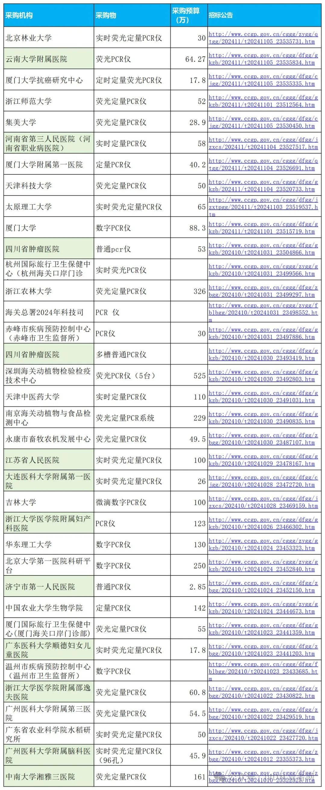 从检索数据来看,自今年4月份开始,PCR仪相关仪器的采购活动就明显高于去年同期的水平,一方面得益于医疗设备等以旧换新的政策、另一方面此前未被核酸筛查覆盖到的机构采购需求开始上升。 我们整理了近期的“PCR仪”采购记录: (1)从统计的数据来看,医院端的采购需求仅有三分之一,医学院校及科研机构等采购需求占到三分之二。 (2)粗略统计,>50万的PCR仪,主要以进口品牌为主,例如罗氏480(384孔)、ABI、伯乐CF96等品牌。 综上来看,2024年的PCR仪器市场相较于2023年有了一定的改善,但主要集中在大学院校和科研机构的采购需求,医院端的设备采购则主要以更新和补充进口高性能设备为主。 这里有两个启发: 第一个是作为PCR仪器厂家最近几年可以多关注关注生命科学领域市场。 第二个从产品研发的角度,要尽可能朝着高性能、高自动化和封闭化的方向发展,打造下一代PCR仪,才有破局的可能性。 |