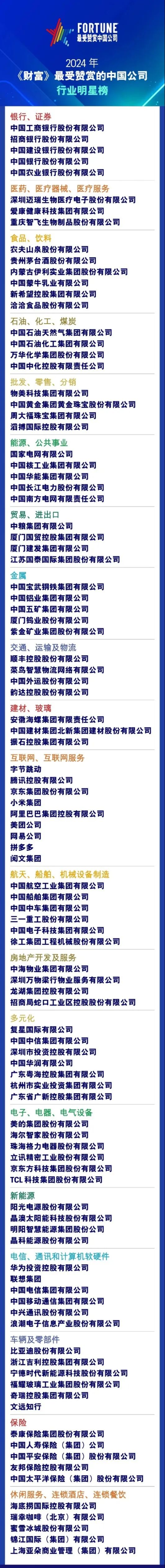 《财富》最受赞赏的中国公司榜单体现了中国企业群体的“软实力”。“软实力”包括但不限于管理、人才吸引力、产品或服务、社会责任、投资价值、资产和全球化等方面的能力。 深圳迈瑞生物医疗电子股份有限公司上榜。 《财富》最受赞赏的中国公司榜单是对企业软实力的考量。参与榜单申报而进入候选池的332家公司既有《财富》世界500强和中国500强,也有“镁光灯下”的明星公司。 《财富》(中文版)通过网络向40,111名中国企业管理人发放了问卷。问卷分两部分,第一部分是依据受访者所在行业,请受访者从管理能力、人才吸引力、产品/服务能力、社会责任、投资价值、资产和全球化等几个角度,对同行业候选公司进行打分,与编辑部评分加权计算后,行业综合得分领先的公司进入行业明星榜。第二部分是受访者在所有的侯选公司中不分行业选出心目中最受推崇的公司,与编辑部评分加权计算后,综合得分最高的50家公司荣登“《财富》最受赞赏的中国公司”全明星榜。在任何情况下,接受调查者都不得选择自己所在的公司。 完整榜单 |