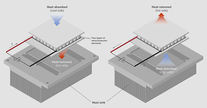 热循环仪中所使用的固定状态的Peltier模块可通过控制电流的方向来实现加热和冷却的功能,更为先进的Peltier系统可实现更为快速的(如每秒6°C)模块加热和冷却过程。Peltier模块的基本原理:两种不同的材料(在这里是半导体)被连接时,根据不同的电流方向会产生热或发生热吸收。