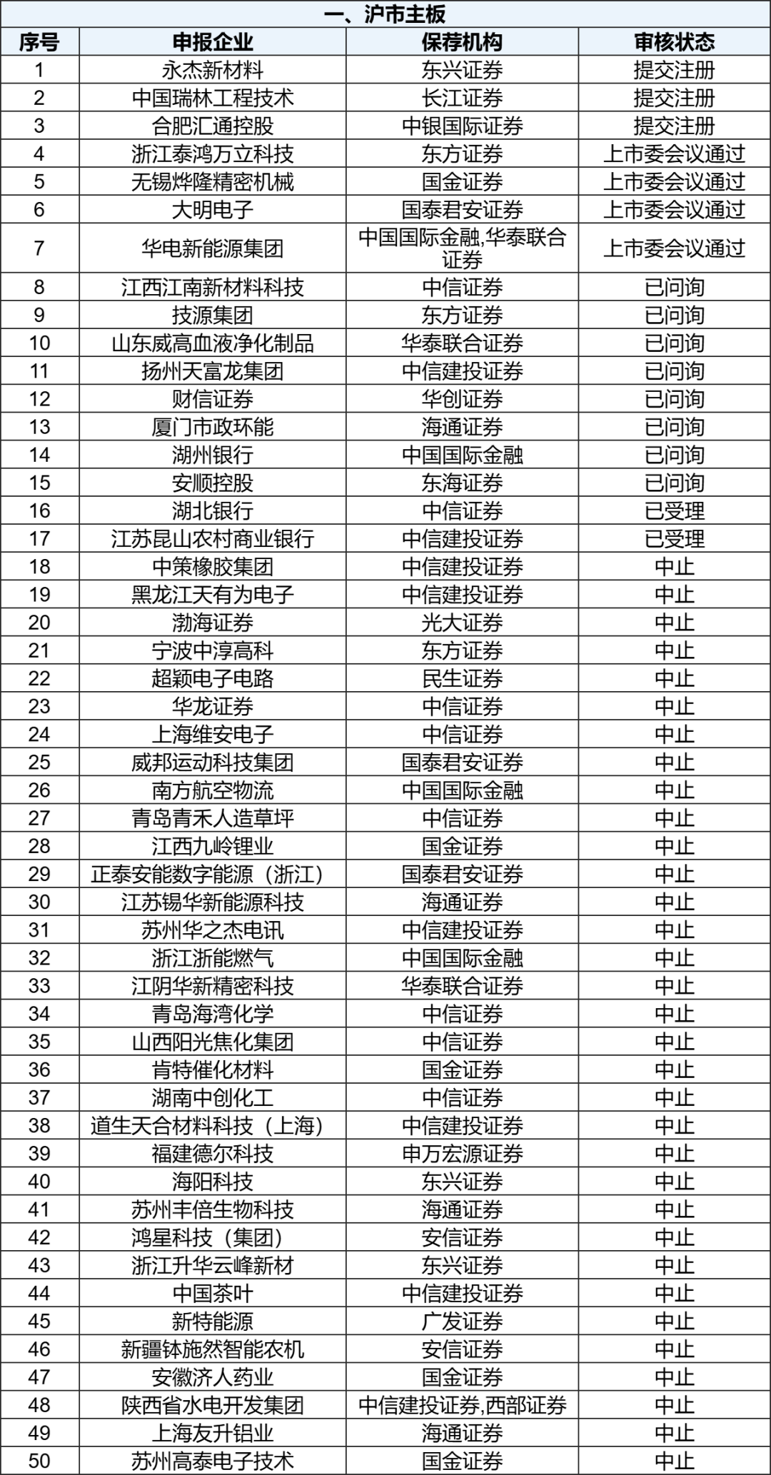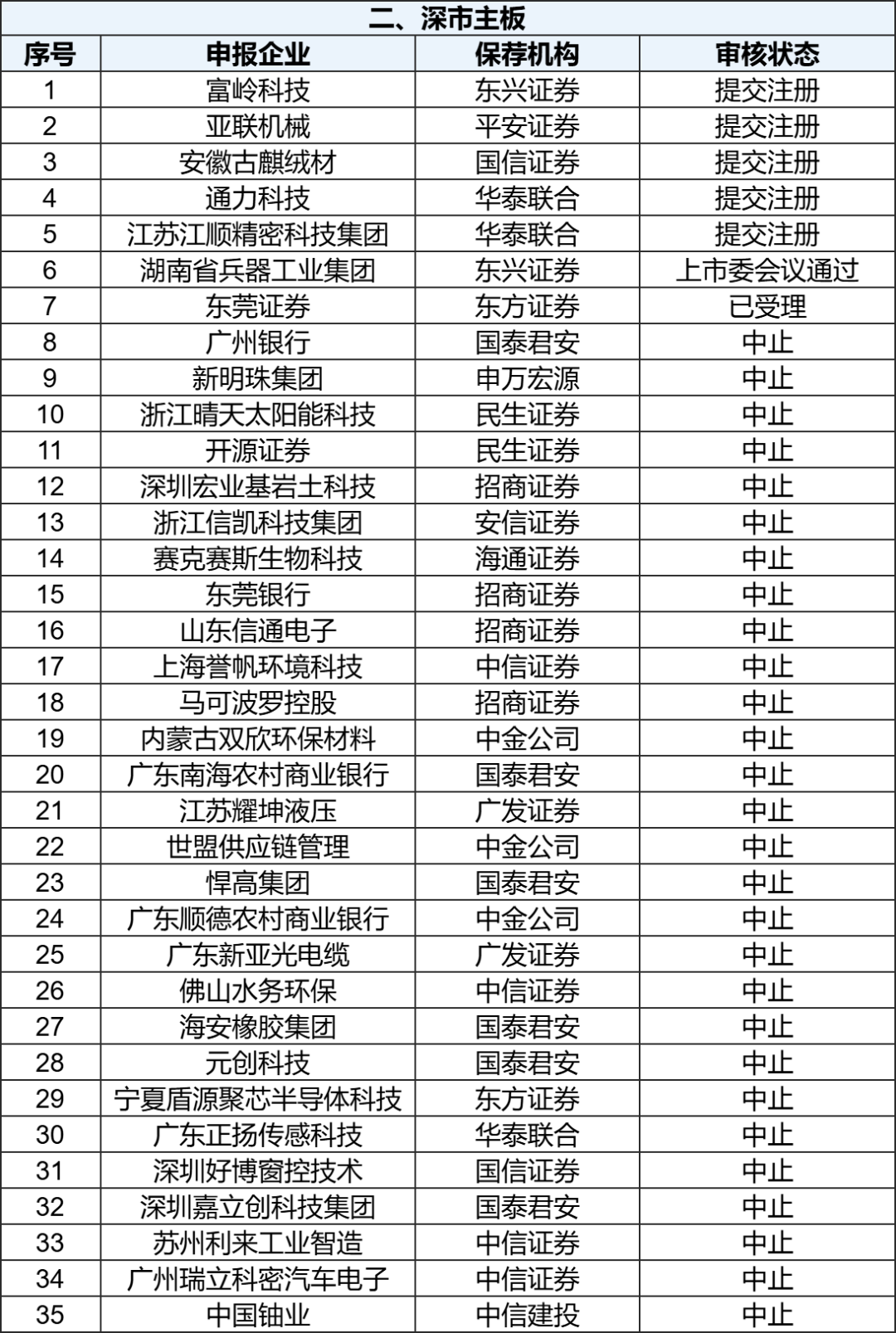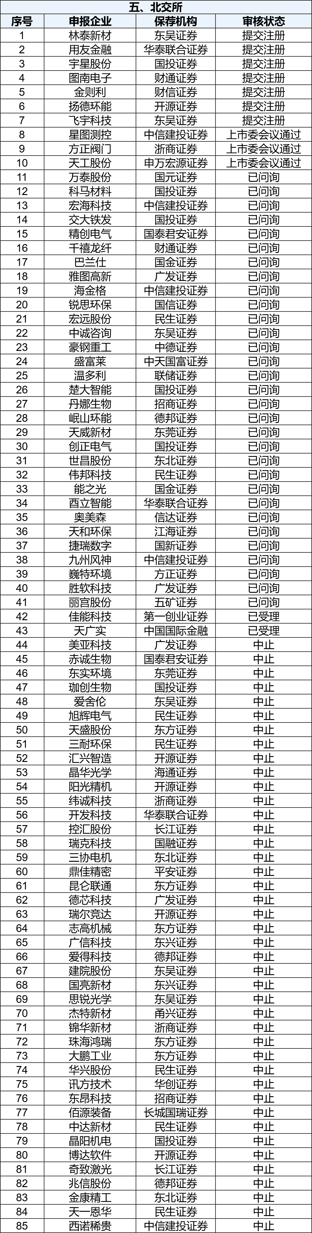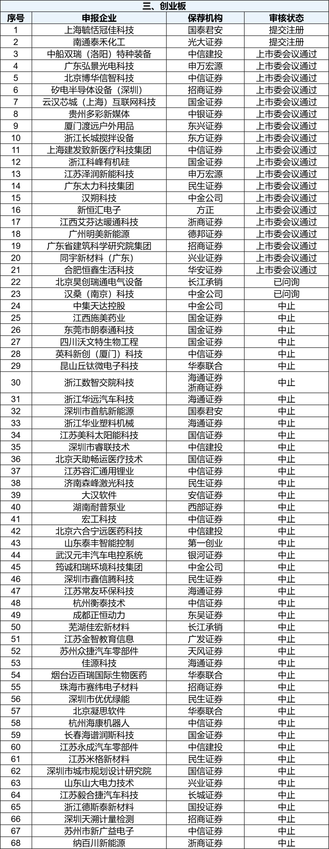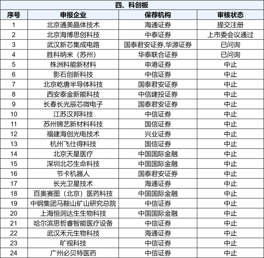 各板块IPO排队名单 截至11月10日,上交所IPO排队企业中,主板共50家,其中受理2家,问询8家,上市委会议通过4家,提交注册3家,中止33家。 【深主板】 截至11月10日,深交所IPO排队企业中,主板共35家,其中受理1家,上市委会议通过1家,提交注册5家,中止28家。 【创业板】 截至11月10日,深交所IPO排队企业中,创业板共68家,其中问询2家,上市委会议通过19家,提交注册2家,中止45家。 【科创板】 截至11月10日,上交所IPO排队企业中,科创板共24家,其中问询2家,上市委会议通过1家,提交注册1家,中止20家。 【北交所】 截至11月10日,北交所公开发行并上市排队企业共85家,其中受理2家,问询31家,上市委会议通过3家,提交注册7家,中止42家。 注:上述表格未包含注册生效、不予注册及终止的IPO企业,以“审核状态”正序排序。 数据说明: 1、以上数据由IPO财务根据证监会网站、相关公开信息收集整理,仅供参考,最新数据以官方披露为准。 2、本公众号文章所涉及的市场评论、图表数据、市场现象描述等,仅作为资讯参考,不构成任何投资建议。 |