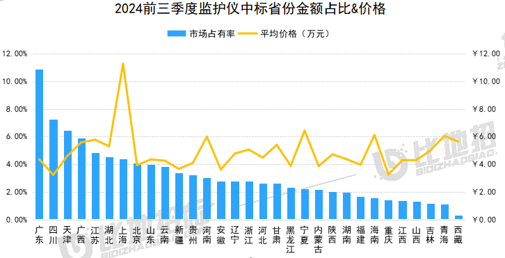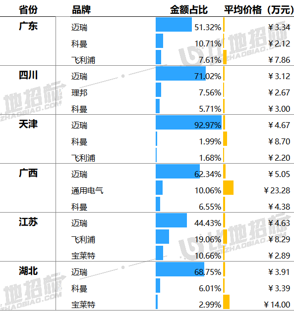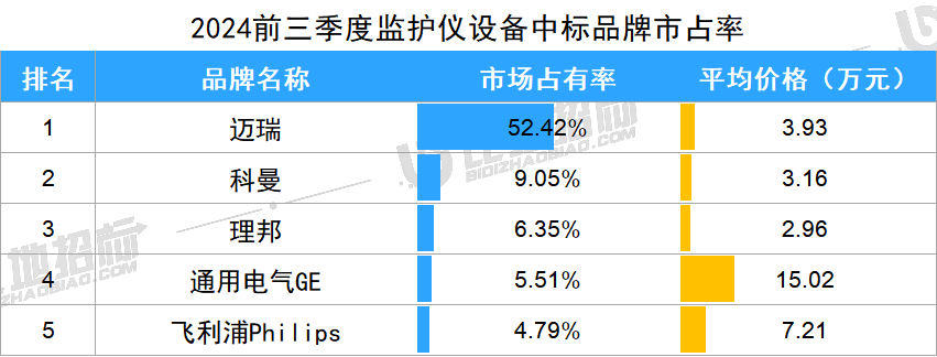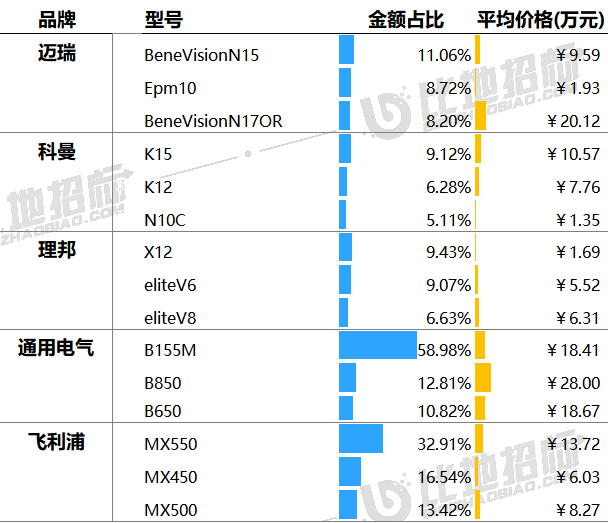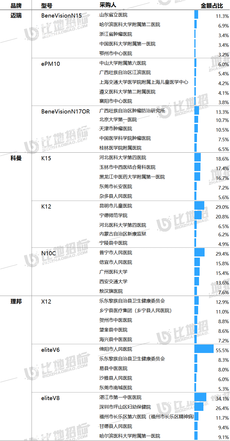 据比地招标网统计:2024年前三季度,监护仪招投标市场有3371家采购单位,4142家中标单位,中标设备数量达31733台,中标总金额约18.24亿元。 (产品关键词:监护仪、心电监护仪、病人监护仪等) 01 品牌市占率 设备品牌方面,金额市占率较高的品牌有迈瑞、科曼、理邦,市占分别为52.42%、9.05%、6.35%。前3品牌合计占比达68%,品牌集中度较高。 数据来源:比地招标网 02 区域占比与价格 区域方面,广东、四川、天津,中标金额占比分别为10.89%、7.27%、6.44%,前三区域合计占比达25%,集中度相对较小。 价格方面,上海、宁夏、海南平均金额相对较高,平均单价分别为11.26万元、6.43万元、6.11万元;安徽、重庆、四川平均金额相对较低,平均单价分别为3.61万元、3.26万元、3.22万元。 数据来源:比地招标网 03 TOP地区品牌偏好 不同地区对品牌的偏好有所不同,广东偏好迈瑞、科曼、飞利浦;四川偏好迈瑞、理邦、科曼;天津偏好迈瑞、科曼、飞利浦等。 数据来源:比地招标网 04 主流品牌型号 主要品牌型号金额占比&价格 主流品牌型号包括,迈瑞的BeneVisionN15、Epm10、BeneVisionN17OR;科曼的K15、K12、N10C;理邦的X12、eliteV6、eliteV8等。 数据来源:比地招标网 05 主要采购人 主要采购单位及对应中标品牌包括:山东省立医院(迈瑞),河北医科大学第四医院(科曼),乐东黎族自治县卫生健康委员会(理邦)等。 TOP3品牌型号采购人采购金额占比 数据来源:比地招标网 06 主要供应商 主要供应商及对应中标品牌包括:中国医疗器械山东有限公司(迈瑞),河北世越医疗器械贸易有限公司(科曼),鹰潭鹿安医疗器械有限公司(理邦)等。 TOP3品牌型号供应商中标金额占比 数据来源:比地招标网 // 数据说明 文丨比地招标研究院 统计时段:2024年1月1日~2024年09月30日 产品关键词:监护仪、心电监护仪、病人监护仪等。 数据来源:各政府采购、公共资源交易中心、企事业单位等网站公开的招标采购项目信息,基于招标采购大数据挖掘分析整理。 报告声明:本报告数据来源于各类型采购信息公开网站的采购项目信息,由于采购信息的非完全披露所导至的误差等原因,各项数据及指标仅供参考。 |