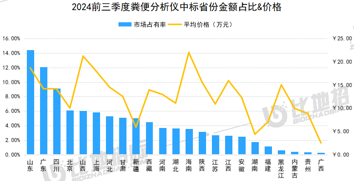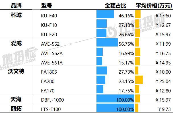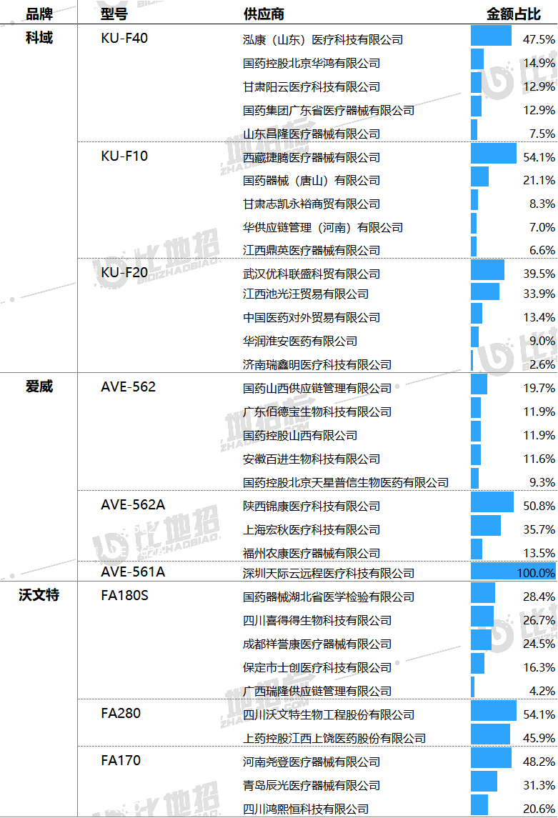 据比地招标网统计:2024年前三季度,粪便分析仪招投标市场有156家采购单位,153家中标单位,中标设备数量达205台,中标总金额约0.28亿元。 (产品关键词:粪便分析仪、全自动粪便分析仪、全自动大便分析仪等) 01 品牌市占率 设备品牌方面,金额市占率较高的品牌有科域、爱威、沃文特,市占分别为33.66%、23.62%、23.02%。前3品牌合计占比达80%,品牌集中度非常高。 数据来源:比地招标网 02 区域占比与价格 区域方面,山东、广东、四川,中标金额占比分别为14.42%、12.10%、9.15%,前三区域合计占比达36%,区域集中度较高。 价格方面,海南、山西、山东平均金额相对较高,平均单价分别为21.99万元、21.20万元、18.68万元;新疆、湖南、广西平均金额相对较低,平均单价分别为5.91万元、4.38万元、2.49万元。 数据来源:比地招标网 03 TOP地区品牌偏好 不同地区对品牌的偏好有所不同,山东偏好科域、法迈特、沃文特;广东偏好爱威、天海、科域;四川偏好沃文特、爱威、丽拓等。 数据来源:比地招标网 04 主流品牌型号 主要品牌型号金额占比&价格 主流品牌型号包括,科域的KU-F40、KU-F10、KU-F20;爱威的AVE-562、AVE-562A、AVE-561A;沃文特的FA180S、FA280、FA170等。 数据来源:比地招标网 05 主要采购人 主要采购单位及对应中标品牌包括:烟台市奇山医院(烟台市传染病医院)(科域),长治市中医研究所附属医院(爱威),鄂州市中心医院(沃文特)等。 TOP3品牌型号采购人采购金额占比 数据来源:比地招标网 06 主要供应商 主要供应商及对应中标品牌包括:泓康(山东)医疗科技有限公司(科域),国药山西供应链管理有限公司(爱威),国药器械湖北省医学检验有限公司(沃文特)等。 TOP3品牌型号供应商中标金额占比 数据来源:比地招标网 // 数据说明 文丨比地招标研究院 统计时段:2024年1月1日~2024年09月30日 产品关键词:粪便分析仪、全自动粪便分析仪、全自动大便分析仪等。 数据来源:各政府采购、公共资源交易中心、企事业单位等网站公开的招标采购项目信息,基于招标采购大数据挖掘分析整理。 报告声明:本报告数据来源于各类型采购信息公开网站的采购项目信息,由于采购信息的非完全披露所导至的误差等原因,各项数据及指标仅供参考。 |