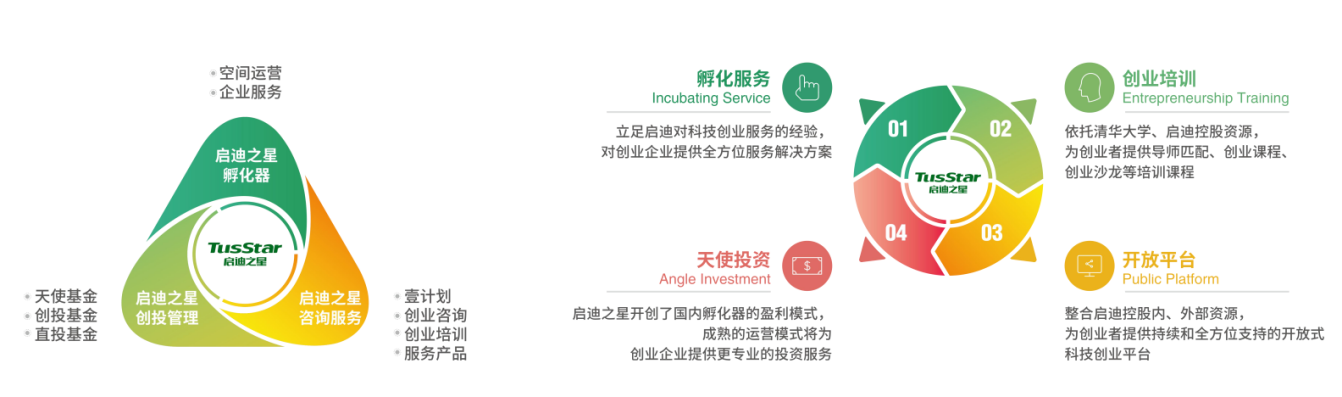 通过“四位一体”(孵化服务+天使投资+创业培训+开放平台)的运营体系,启迪孵化器构建了以“启迪之星孵化器”、“启迪之星创投”、“启迪之星壹计划”为代表的孵化、投资、咨询三大业务线,成功搭建起一个充满活力的创新创业生态。