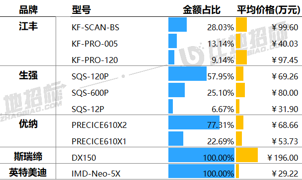 据比地招标网统计:2024年前三季度,病理切片扫描仪招投标市场有102家采购单位,82家中标单位,中标设备数量达125台,中标总金额约1.03亿元。 (产品关键词:病理切片扫描仪、数字病理切片扫描仪、玻片扫描影像系统等) 01 品牌市占率 设备品牌方面,金额市占率较高的品牌有江丰、生强、优纳,市占分别为43.47%、24.07%、19.12%。前3品牌合计占比达87%,品牌集中度非常高。 数据来源:比地招标网 02 区域占比与价格 区域方面,湖北、浙江、广东,中标金额占比分别为44.79%、9.84%、8.84%,前三区域合计占比达63%,区域集中度非常高。 价格方面,上海、黑龙江、广东平均金额相对较高,平均单价分别为120.00万元、97.97万元、94.91万元;四川、贵州平均金额相对较低,平均单价分别为20.07万元、19.51万元。 数据来源:比地招标网 03 TOP地区品牌偏好 不同地区对品牌的偏好有所不同,湖北偏好优纳、生强、江丰;浙江偏好江丰;广东偏好斯瑞缔、江丰、生强等。 数据来源:比地招标网 04 主流品牌型号 主要品牌型号金额占比&价格 主流品牌型号包括,江丰的KF-SCAN-BS、KF-PRO-005、KF-PRO-120;生强的SQS-120P、SQS-600P、SQS-12P;优纳的PRECICE610X2、PRECICE610X1等。 数据来源:比地招标网 05 主要采购人 主要采购单位及对应中标品牌包括:鄂州市中心医院(江丰),潜江市中心医院(生强),安陆市普爱医院(人民医院)(优纳)等。 TOP3品牌型号采购人采购金额占比 数据来源:比地招标网 06 主要供应商 主要供应商及对应中标品牌包括:泓康(山东)医疗科技有限公司(江丰),中移系统集成有限公司(生强),中电信数智科技有限公司(优纳)等。 TOP3品牌型号供应商中标金额占比 数据来源:比地招标网 // 数据说明 文丨比地招标研究院 统计时段:2024年1月1日~2024年09月30日 产品关键词:病理切片扫描仪、数字病理切片扫描仪、玻片扫描影像系统等。 数据来源:各政府采购、公共资源交易中心、企事业单位等网站公开的招标采购项目信息,基于招标采购大数据挖掘分析整理。 报告声明:本报告数据来源于各类型采购信息公开网站的采购项目信息,由于采购信息的非完全披露所导至的误差等原因,各项数据及指标仅供参考。 |
