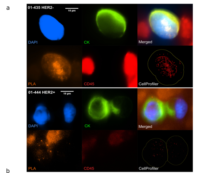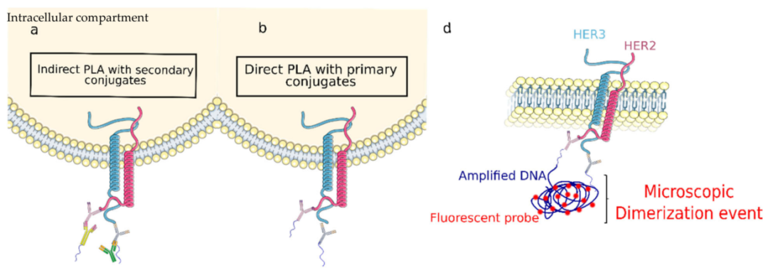 在临床中,抗HER2单克隆抗体曲妥珠单抗(trastuzumab)取得了突破,该抗体可抑制配体非依赖性HER2/HER3信号传导并触发免疫原性反应,使用这种靶向治疗与HER2阳性乳腺癌患者临床结局的显著改善相关,包括预期寿命的大幅延长和复发率的降低。 然而,最近对肿瘤组织中HER2-HER3二聚化水平的评估显示了其作为预测生物标志物的潜力。特别是,使用FRET-FLIM (Förster共振能量转移-荧光寿命成像显微镜)确定FFPE肿瘤组织的HER2- her3二聚化状态已被证明可预测术后10年内转移复发的可能性,而不依赖于肿瘤HER2表达。 循环肿瘤细胞(circulating tumor cells, CTC)已被证明是不同类型癌症的预后因素,尤其是乳腺癌。CTC是血液中从原发或继发肿瘤部位释放的恶性细胞,有可能扩散到远处器官并导至转移。目前尚未对CTCs的HER2-HER3二聚化状态进行评估。检测CTCs中HER2-HER3二聚化状态可能是帕妥珠单抗疗效的潜在无创预测指标。 在本文中,作者重点关注一种被称为HER2阳性乳腺癌亚型,这种癌症与癌细胞的质膜上HER2蛋白的扩增有关。与靶向HER2蛋白的治疗相结合,HER2- HER3二聚化阻断,进一步改善了患者的结局。在这项工作中,作者提出了一种新的方法,通过芯片结合原位邻近连接试验来表征CTC,从而可以在单个CTC水平上量化HER2-HER3二聚化事件[2]。 什么是邻近连接实验(PLA)? PLA是一种依赖于抗体和寡核苷酸结合特异性的免疫染色变体。在一个典型的PLA实验中,两种抗体被用来识别两种感兴趣的蛋白质。每个抗体与一段彼此互补的短序列寡核苷酸偶联,标记为PLUS和MINUS探针。当这些探针的接近距离小于40nm时,添加两个与探针杂交的连接寡核苷酸将导至在连接酶存在的情况下形成一个闭合环状模板。随后添加聚合酶和荧光标记的寡核苷酸,然后导至闭合环状模板(D)的滚环扩增,可以可视化为一个可以通过表观荧光或共聚焦显微镜检测和定量的独特荧光点。由于只测量滚环模板的荧光信号,PLA具有良好的信噪比和较高的空间精度和灵敏度 [1] 。 PLA技术应用于CTC中HER2-HER3 二聚化状态二聚化状态检测 为了评估单个CTC的HER2-HER3二聚化状态,作者使用了PLA技术。有两种类型的PLA:直接和间接。在直接PLA中PLA探针偶联于一抗,而在间接PLA中偶联于二抗。PLA最广泛使用的方法是上述间接PLA,其中使用与寡核苷酸探针偶联的二抗。 首先用EpCAM阳性的癌细胞系优化PLA条件,这些癌细胞系可以模拟CTC的上皮表型,接种在玻璃玻片上。特别地,作者首先优化了细胞通透性时间和抗体浓度。作者使用了已知HER2高表达和低表达的细胞系:HER2扩增的SKBR-3(评分3+)和HER2-低表达的MDA-MB-231(评分0 ~ 1+)。 分析过程的另一个重要方面是将PLA与若干标记物的免疫染色相结合,这些标记物用于确定每个捕获细胞的肿瘤状态。CTC的定义为上皮有核细胞(DAPI+,细胞角蛋白或CK+) C45染色阴性(CD45−);由于免疫染色,它们可以与CTC分析中经常发现的污染内皮细胞区别,而这是由于捕获过程的选择性不完善[3]。作者发现免疫染色不能在PLA之前进行,因为信号会受到PLA条件的影响,特别是加热步骤。然而,作者能够进行HER2-HER3 PLA,然后进行免疫染色。在这些条件下,作者可以成功检测到HER2-HER3二聚化事件的数量和CTC标志物:DAPI+ CK+ CD45(下图e)。 芯片上PLA集成研究单CTC的芯片上 HER2-HER3二聚化 Ephesia系统依赖于免疫磁性富集,即通过抗EpCAM抗体的磁珠形成的自组装磁柱阵列捕获细胞。芯片的顶部包括4个捕获室,总长度为3.3 cm,宽度为3 mm,具有优化的金刚石形状流动通道。芯片的底部有48000个孔,排成48行和1000列的六角形阵列,间距为60µm,圆的直径为15µm,圆的深度为10µm。这种模式决定了磁柱的设计,旨在提供最佳的电池捕获效率。 为了进一步证明PLA信号在芯片上实现的特异性,作者使用siRNA敲低了SK-BR-3细胞系中的HER2和/或HER3基因。作者对HER2和HER3分别以及联合进行了基因沉默。作者观察到,在siHER2或siHER3处理的细胞中,每个细胞的PLA信号数量显著减少,当HER2和HER3基因均被敲低时,PLA信号数量甚至更多(下图c)。作者观察到,在HER2/HER3敲低的细胞中,PLA信号的平均值从132个信号/细胞下降到24个信号/细胞(下图c)。总之,这些结果证明了ctc检测的特异性,并证实了Ephesia芯片捕获的上皮细胞状态可以结合PLA在单细胞水平定量和特异地评估HER2-HER3二聚化事件。 实现片上PLA来分析单个ctc需要大量重新设计Ephesia工作流程。 转移性乳腺癌患者血液中单CTC聚乳酸的 片上分析 为了证明这种检测的临床潜力,作者对转移性乳腺癌(MBC)患者的血液样本进行了相同的分析。与细胞系实验类似,作者在每个患者样本的芯片上进行了CTC捕获、HER2-HER3 PLA以及用于CTC鉴定的免疫染色(DAPI+、CK+、CD45 -)。下图a展示对来自HER2−(01-435)或HER2+(01-444)患者的血液实施的实施例。接下来,作者描述了在检出CTC的每例患者中,每个CTC的PLA信号分布(下图b)。作者观察到HER2-HER3 PLA谱的广泛异质性(下图b)。约1 / 3患者的PLA信号平均值较低且分布较窄,而其余患者的HER2- HER3二聚体事件分布较多。 这些数据证明了通过芯片CTC捕获、PLA鉴定、蛋白marker染色,直接从血液样本中评估单个CTC的HER2-HER3状态的可能性。然而,未来应该分析更多的样本,以进一步评估这种状态如何与患者对治疗的反应相关。 杭州乐为生医公司可提供抗体寡核苷酸偶联技术服务及成品试剂盒。助力您在实验室条件下即可轻松实现Ab-oligo的高效