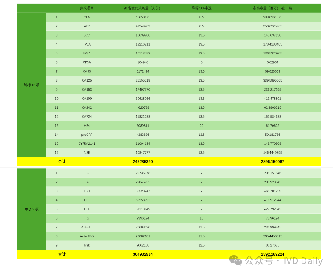 | 23日,安徽省医疗保障局牵头开展的肿标和甲功集采公布2号采购文件!安徽省、北京市、天津市、河北省、山西省、内蒙古自治区、辽宁省、吉林 省、黑龙江省、上海市、福建省、江西省、河南省、湖北省、湖 南省、广西壮族自治区、海南省、重庆市、四川省、贵州省、云 南省、西藏自治区、陕西省、甘肃省、青海省、宁夏回族自治区、 新疆维吾尔自治区、新疆生产建设兵团28省(区、兵团)医疗保障局肿标16项首年28省(区、兵团)采购意向采购量合计2.45亿人份,甲功9项首年28省(区、兵团)采购意向采购量合计3.05亿人份,合计28省肿标16项+甲功9项约5.5亿人份采购量!从出厂端来看,市场容量价格按照降价50%中选计算,肿标市场28省(区、兵团)约29个亿,甲功市场28省(区、兵团)约24个亿,合计一个近53亿的发光市场最大两类已经纳入集采!从终端市场来看,结合12月份初国家医保局公布的第二批肿标价格治理限价(HE4按照均价90元)计算,肿瘤标志物16项28省(区、兵团)终端市场容量约110亿!总体来看肿标+甲功终端市场约200亿,出厂端约53亿的市场,集采大刀加价格治理的政策轮番轰炸,有多少人正陷其中?个中辛酸恐怕只有局中人才了然!降幅50%中选价格,甲功均价9元,肿标均价13元!拟中选规则来看:肿瘤标志物十六项和甲状腺功能九项两类产品分别组套申报整体降幅,按降幅由高到低的顺序确定排名,降幅最高的为第一 名,次高的为第二名,依此类推。按照中选规则二:整体申报降幅高于50%(>50%)来算,肿瘤标志物16项均价13元,甲功9项均价9元!而实际只会更低,因为规则要求降幅不能等于50%!这个价格和各企业的最低中标价格差不多,详见如下文件:总体来看,政策还是相对温和,国产出厂价肿标在6-7元/人份,甲功在4-5元/人份,基本保证了渠道50%左右的空间;但对于进口品牌而言这价格相对难受,如某外企CEA省级最低挂网价13块多,和此次8.5元的差距还比较远,所以说集采价格体系重塑了外企对于市场的认知和接下来的市场布局!据路边社消息,某肿标大户外企这两天已经开始发放圣诞裁员大礼包!此次集采把国产和进口拉到同一起跑线,未来几年发光国产替代逻辑依然清晰!2024年岁末降至,随着安徽医保局2号集采公告的发布,发光厂家的价格厮杀才刚刚开始!展望2025乙巳蛇年,打工路还在,只是走法发生了翻天地覆变化。最后开标时间估计得到2025年一月份了,诸君静候3号文的公布!其实最后结果想必各位早已有答案,鹿死谁手不是目的,行业百花齐放才是春!