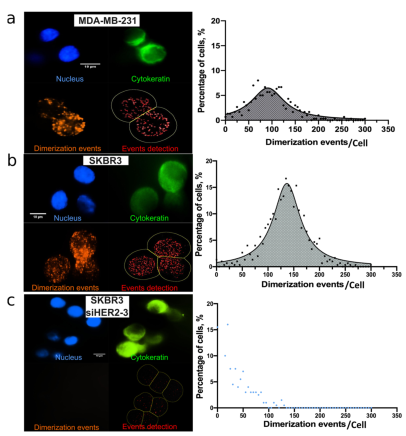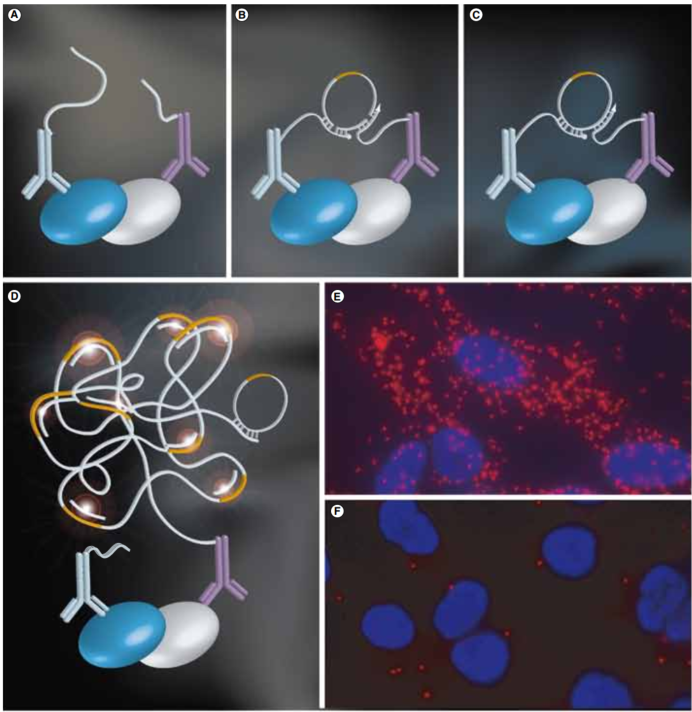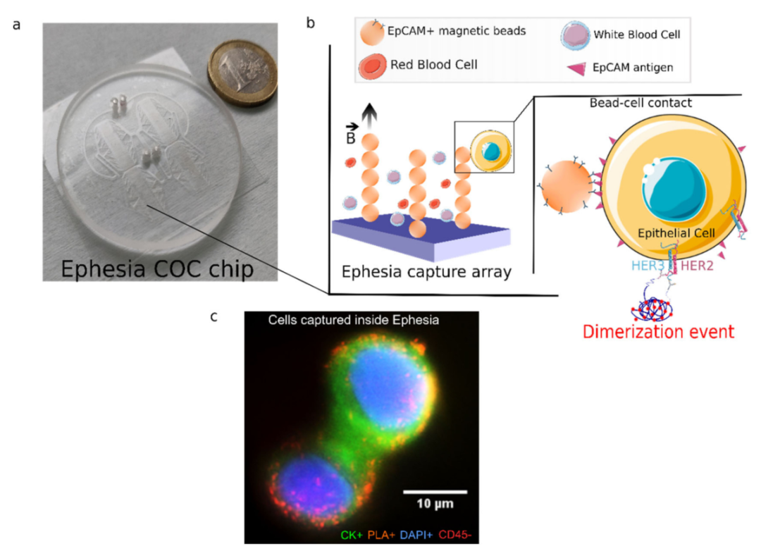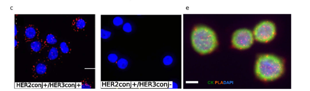 在临床中,抗HER2单克隆抗体曲妥珠单抗(trastuzumab)取得了突破,该抗体可抑制配体非依赖性HER2/HER3信号传导并触发免疫原性反应,使用这种靶向治疗与HER2阳性乳腺癌患者临床结局的显著改善相关,包括预期寿命的大幅延长和复发率的降低。 然而,最近对肿瘤组织中HER2-HER3二聚化水平的评估显示了其作为预测生物标志物的潜力。特别是,使用FRET-FLIM (Förster共振能量转移-荧光寿命成像显微镜)确定FFPE肿瘤组织的HER2- her3二聚化状态已被证明可预测术后10年内转移复发的可能性,而不依赖于肿瘤HER2表达。 循环肿瘤细胞(circulating tumor cells, CTC)已被证明是不同类型癌症的预后因素,尤其是乳腺癌。CTC是血液中从原发或继发肿瘤部位释放的恶性细胞,有可能扩散到远处器官并导至转移。目前尚未对CTCs的HER2-HER3二聚化状态进行评估。检测CTCs中HER2-HER3二聚化状态可能是帕妥珠单抗疗效的潜在无创预测指标。 在本文中,作者重点关注一种被称为HER2阳性乳腺癌亚型,这种癌症与癌细胞的质膜上HER2蛋白的扩增有关。与靶向HER2蛋白的治疗相结合,HER2- HER3二聚化阻断,进一步改善了患者的结局。在这项工作中,作者提出了一种新的方法,通过芯片结合原位邻近连接试验来表征CTC,从而可以在单个CTC水平上量化HER2-HER3二聚化事件[2]。 什么是邻近连接实验(PLA)? PLA是一种依赖于抗体和寡核苷酸结合特异性的免疫染色变体。在一个典型的PLA实验中,两种抗体被用来识别两种感兴趣的蛋白质。每个抗体与一段彼此互补的短序列寡核苷酸偶联,标记为PLUS和MINUS探针。当这些探针的接近距离小于40nm时,添加两个与探针杂交的连接寡核苷酸将导至在连接酶存在的情况下形成一个闭合环状模板。随后添加聚合酶和荧光标记的寡核苷酸,然后导至闭合环状模板(D)的滚环扩增,可以可视化为一个可以通过表观荧光或共聚焦显微镜检测和定量的独特荧光点。由于只测量滚环模板的荧光信号,PLA具有良好的信噪比和较高的空间精度和灵敏度 [1] 。 PLA技术应用于CTC中HER2-HER3 二聚化状态二聚化状态检测 为了评估单个CTC的HER2-HER3二聚化状态,作者使用了PLA技术。有两种类型的PLA:直接和间接。在直接PLA中PLA探针偶联于一抗,而在间接PLA中偶联于二抗。PLA最广泛使用的方法是上述间接PLA,其中使用与寡核苷酸探针偶联的二抗。 首先用EpCAM阳性的癌细胞系优化PLA条件,这些癌细胞系可以模拟CTC的上皮表型,接种在玻璃玻片上。特别地,作者首先优化了细胞通透性时间和抗体浓度。作者使用了已知HER2高表达和低表达的细胞系:HER2扩增的SKBR-3(评分3+)和HER2-低表达的MDA-MB-231(评分0 ~ 1+)。 分析过程的另一个重要方面是将PLA与若干标记物的免疫染色相结合,这些标记物用于确定每个捕获细胞的肿瘤状态。CTC的定义为上皮有核细胞(DAPI+,细胞角蛋白或CK+) C45染色阴性(CD45−);由于免疫染色,它们可以与CTC分析中经常发现的污染内皮细胞区别,而这是由于捕获过程的选择性不完善[3]。作者发现免疫染色不能在PLA之前进行,因为信号会受到PLA条件的影响,特别是加热步骤。然而,作者能够进行HER2-HER3 PLA,然后进行免疫染色。在这些条件下,作者可以成功检测到HER2-HER3二聚化事件的数量和CTC标志物:DAPI+ CK+ CD45(下图e)。 芯片上PLA集成研究单CTC的芯片上 HER2-HER3二聚化 Ephesia系统依赖于免疫磁性富集,即通过抗EpCAM抗体的磁珠形成的自组装磁柱阵列捕获细胞。芯片的顶部包括4个捕获室,总长度为3.3 cm,宽度为3 mm,具有优化的金刚石形状流动通道。芯片的底部有48000个孔,排成48行和1000列的六角形阵列,间距为60µm,圆的直径为15µm,圆的深度为10µm。这种模式决定了磁柱的设计,旨在提供最佳的电池捕获效率。 为了进一步证明PLA信号在芯片上实现的特异性,作者使用siRNA敲低了SK-BR-3细胞系中的HER2和/或HER3基因。作者对HER2和HER3分别以及联合进行了基因沉默。作者观察到,在siHER2或siHER3处理的细胞中,每个细胞的PLA信号数量显著减少,当HER2和HER3基因均被敲低时,PLA信号数量甚至更多(下图c)。作者观察到,在HER2/HER3敲低的细胞中,PLA信号的平均值从132个信号/细胞下降到24个信号/细胞(下图c)。总之,这些结果证明了ctc检测的特异性,并证实了Ephesia芯片捕获的上皮细胞状态可以结合PLA在单细胞水平定量和特异地评估HER2-HER3二聚化事件。 实现片上PLA来分析单个ctc需要大量重新设计Ephesia工作流程。 转移性乳腺癌患者血液中单CTC聚乳酸的 片上分析 为了证明这种检测的临床潜力,作者对转移性乳腺癌(MBC)患者的血液样本进行了相同的分析。与细胞系实验类似,作者在每个患者样本的芯片上进行了CTC捕获、HER2-HER3 PLA以及用于CTC鉴定的免疫染色(DAPI+、CK+、CD45 -)。下图a展示对来自HER2−(01-435)或HER2+(01-444)患者的血液实施的实施例。接下来,作者描述了在检出CTC的每例患者中,每个CTC的PLA信号分布(下图b)。作者观察到HER2-HER3 PLA谱的广泛异质性(下图b)。约1 / 3患者的PLA信号平均值较低且分布较窄,而其余患者的HER2- HER3二聚体事件分布较多。 这些数据证明了通过芯片CTC捕获、PLA鉴定、蛋白marker染色,直接从血液样本中评估单个CTC的HER2-HER3状态的可能性。然而,未来应该分析更多的样本,以进一步评估这种状态如何与患者对治疗的反应相关。 杭州乐为生医公司可提供抗体寡核苷酸偶联技术服务及成品试剂盒。助力您在实验室条件下即可轻松实现Ab-oligo的高效