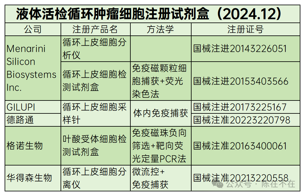 主要是EGFR基因突变试剂盒。 还有两个是与基因甲基化联合检测。 艾德生物拥有第一个肿瘤NGS液体活检注册试剂盒,以及多个PCR液体活检试剂盒,不愧是肿瘤基因行业的No.1,断崖式的存在。 肿瘤基因甲基化 截止到2024年12月,基因甲基化获证32个,其中:31个与肿瘤相关;1个为系统性红斑狼疮。肿瘤基因甲基化试剂盒中:1个样本为石蜡切片,5个为宫颈脱落细胞,其余25个液体活检试剂盒见下表。 microRNA microRNA(miRNA)是一类内生的、长度约 20 - 24 个核苷酸的非编码单链 RNA 分子。 截止到2024年12月,microRNA获证试剂盒3个,见下表。 循环肿瘤细胞 循环肿瘤细胞(CTCs)是一群被认为从原发性肿瘤或转移性肿瘤部位脱离,并在血液中循环的肿瘤细胞。由于它们是完整的活细胞,在循环系统中具有较长的半衰期,并且提供了一些无法通过 ctDNA 分析获得的参数,包括 RNA 和蛋白质分析以及完整的基因组。 捕获 CTCs 进行分析存在重大挑战。CTCs 是罕见事件,即使在转移性癌症患者中,也并不总是存在于外周血中。即使存在,其浓度也非常低,处于每十亿个红细胞和数百万个白细胞中只有一个 CTC 的范围。CTC 标志物可能与原发性肿瘤细胞的标志物不同,并且在治疗过程中也可能发生变化,这使得它们难以靶向定位。 根据《2023年第三次医疗器械产品分类界定结果汇总》,以下建议按第三类医疗器械管理: (四十七)血液循环肿瘤细胞自动分选仪:由精密加样系统(由传输系统、清洗系统、温育系统、混匀系统、软件系统组成)和分选系统(由磁珠吸附模块、样品和磁珠混匀模块、离心模块、照明和UV消毒模块组成)组成。与荧光原位杂交样品处理试剂盒配合使用,用于循环肿瘤细胞的富集,经提取后的细胞用于后续染色计数或其它靶标物质检测。分类编码:22-10。 外囊泡 目前,肿瘤外泌体获证试剂盒仅思路迪一家。通过体外测定人血清外泌体中的CA125、HE4和C5a浓度,并经给定的计算公式计算卵巢癌评分OCS(ovarian cancer score) ,适用于临床上发现有附件包块的女性患者,辅助诊断上皮性卵巢癌。 以上为肿瘤液体活检NMPA注册产品。NIPT及生殖健康,器官移植等方面的液体活检产品未在此列。 液体活检作为一种新兴的肿瘤检测技术,具有无创、可重复等优点,但在临床应用和推广过程中仍面临着诸多挑战: