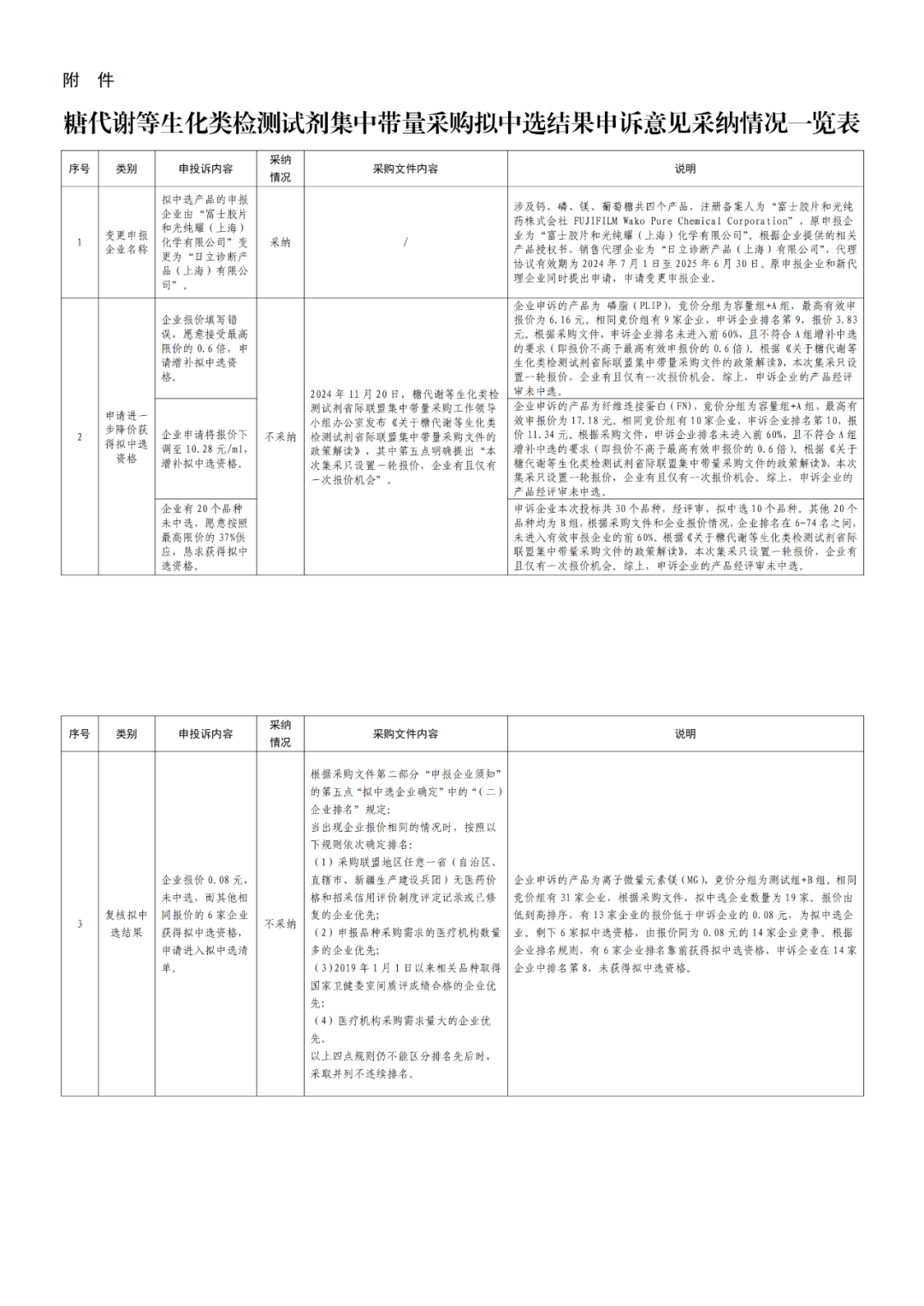 2024年11月28日至2024年12月2日,糖代谢等生化类检测试剂省际联盟集中带量采购工作领导小组办公室对《糖代谢等生化类检测试剂省际联盟集中带量采购拟中选结果》进行公示,公示期间共收到6家企业的申诉意见。申诉意见处理建议经省药品医用耗材集中采购联席会议办公室2024年第4次会议审议通过。现将此次公示申诉意见采纳情况进行公告,具体详见附件。1、申投诉内容:变更申报企业名称:拟中选产品的申报企业由“富士胶片和光纯耀(上海)化学有限公司”变更为“日立诊断产品(上海)有限公司”。