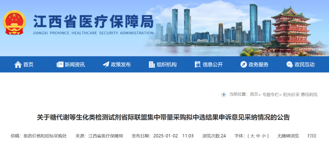 1月2日,江西省医保局发布消息,关于糖代谢等生化类检测试剂省际联盟集中带量采购拟中选结果申诉意见采纳情况的公告。