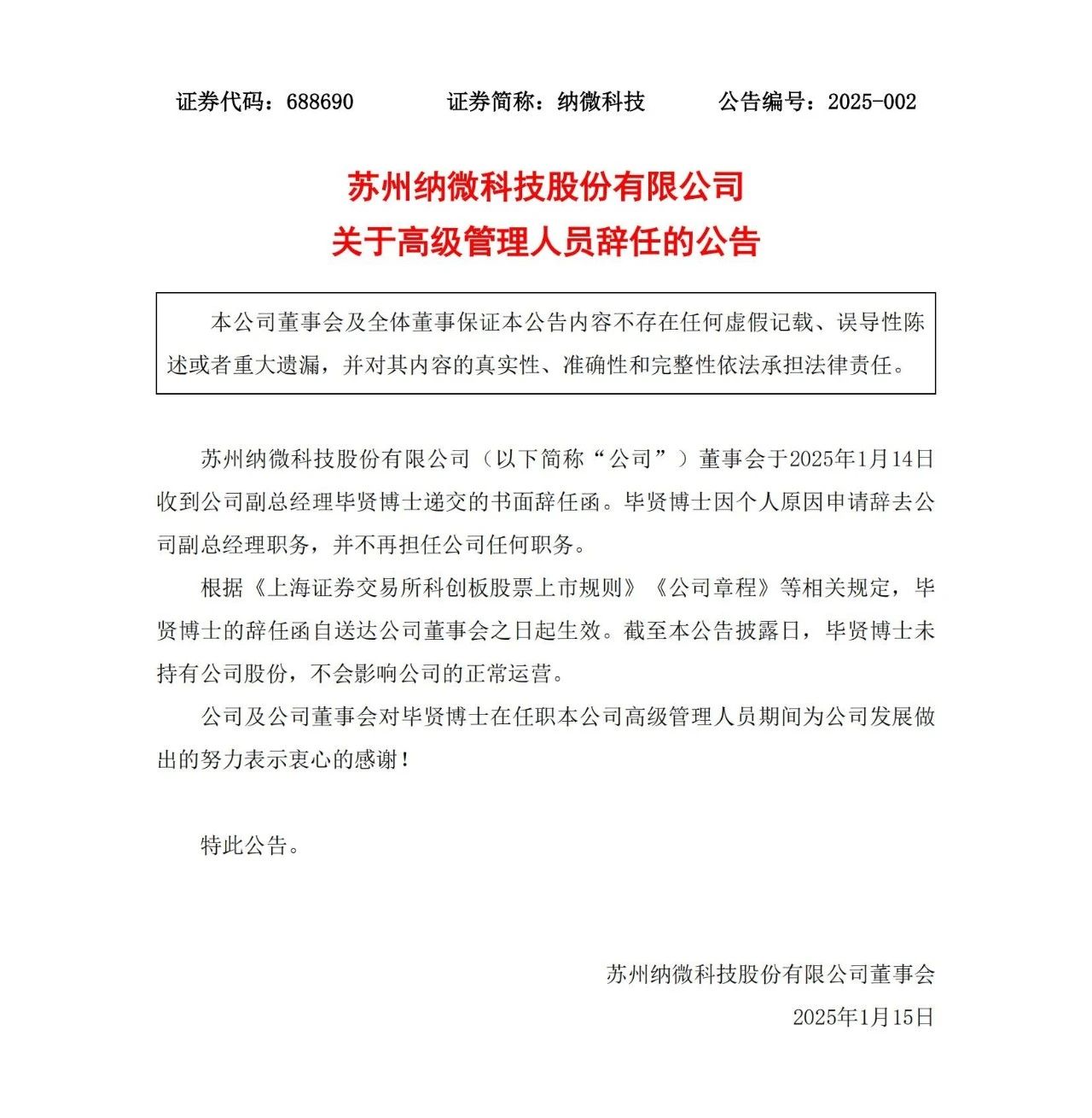 毕贤博士简历 毕贤博士,1976年出生,中国国籍,拥有同济大学学士和博士学位。他的职业生涯丰富多彩,毕贤博士在职业生涯中积累了丰富的管理经验和市场销售经验,曾在多家知名企业担任重要职务: 2004年至2006年,担任赛默飞世尔科技(中国)有限公司销售经理。 2006年至2013年,担任安捷伦科技(中国)有限公司销售经理。 2013年至2015年,担任GE医疗集团生命科学事业部销售经理。 2016年至2021年,历任华粤行仪器有限公司生命科学部总经理、营销中心总经理。 2021年至2023年,担任莫纳(苏州)生物科技有限公司商务副总裁。 2023年至2025年,担任苏州纳微科技股份有限公司副总经理。 2025年1月中旬,申请辞去苏州纳微科技股份有限公司副总经理职务。 |