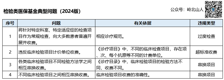 2025年1月11日,国家医保局发布了《国家医疗保障局关于开展2025年定点医药机构违法违规使用医保基金自查自纠工作的通知》。这是自2024年医保飞检常态化工作以来,国家医保局对2025年工作的重要部署。  今年医保基金违规检查,和2024年略有不同。2024年开始,医保飞检遵循“四不两直”的方针,全面铺开。而2025年,则要求定点医药机构自查自纠开始。自查自纠的主体,也从定点医疗机构,延伸至定点医疗机构和定点零售药店两类主体。其次,定点医疗机构自查自纠的范围,从2024年的心血管内科、骨科、血液透析、康复、医学影像、临床检验等6个领域,新增了肿瘤、麻醉、重症医学3个领域,2025年整体形成9个领域对照自查的问题清单。根据《定点医疗机构违法违规使用医疗保障基金典型问题清单(2024版)》文件,临床检验类有4项列入,分别是过度检查、超标准收费、串换方法学收费、串换项目收费四大类。《医疗保障基金使用监督管理条例》第十五条第一款规定,定点医药机构不得违反诊疗规范过度诊疗、过度检查、分解处方、超量开药、重复开药或者提供其他不必要的医药服务。过度诊疗、过度检查:是指医疗服务提供方违反诊疗规范实施不必要的诊疗项目或实施与疾病关联性不高的诊疗、检查项目的行为。1、为开展凝血功能检查的患者普遍开具“血浆D-二聚体测定”;2、同时开展“C—反应蛋白”与“超敏C反应蛋白”;3、为开展肾功能检查的患者普遍开具“血清胱抑素测定”;4、开展血脂检查的患者普遍开具“血清载脂蛋白AI测定”;5、大规模同时开具“降钙素原(PCT)”“超敏C反应蛋白(hs-CRP)”“N端-B型钠尿肽前体(NT-ProBNP)”检测;6、为开展“梅毒螺旋体特异抗体测定”患者普遍开具“不加热血清反应素试验”;7、将“癌胚抗原测定”“糖类抗原测定”“糖化血红蛋白测定”“血栓弹力图试验”列入患者入院常规检查大规模开展。8.糖化血红蛋白测定:对无糖尿病史的患者,入院常规普查“葡萄糖测定”和“糖化血红蛋白测定”。9.Rh血型鉴定、Rh血型其他抗原鉴定;对除有多次输血史以外的病人,普遍存在检查“AB0血型鉴定”的同时,收取“Rh血型鉴定”“Rh血型其他抗原鉴定”的费用。10.血同型半胱氨酸测定;对无高血压、肾病史的患者,入院常规普查“血同型半胱氨酸测定”。12.无机磷测定、镁测定;无指征普遍将“无机磷测定、镁测定”检验项目作为常规检查,并收取费用。13.普遍无指征开具“粪寄生虫镜检”并收费,属于过度检查。其中糖化血红蛋白过度检查已经受到国家医保局专项整治,全国大面积范围处罚排查。而糖类抗原、血栓弹力图,NT-ProBNP等项目,也已经分批次进入价格治理范围。《医疗保障基金使用监督管理条例》第十五条 定点医药机构及其工作人员应当执行实名就医和购药管理规定,核验参保人员医疗保障凭证,按照诊疗规范提供合理、必要的医药服务,向参保人员如实出具费用单据和相关资料,不得分解住院、挂床住院,不得违反诊疗规范过度诊疗、过度检查、分解处方、超量开药、重复开药,不得重复收费、超标准收费、分解项目收费,不得串换药品、医用耗材、诊疗项目和服务设施,不得诱导、协助他人冒名或者虚假就医、购药。超标准收费:是指公立定点医疗机构医疗服务收费标准高于国家、省(自治区、直辖市)、市相关部门规定的价格标准,或者非公立定点医疗机构医疗服务收费标准高于医保服务协议约定的价格标准。1.血气分析同时收取钾、钠、氯、镁、钙检验项目,血气分析含血液PH、血氧和血二氧化碳测定以及酸碱平衡分析。2.肝功能和心肌酶组套均包含血清天门冬氨酸氨基转移酶测定,同时做以上两个组合,重复收取血清天门冬氨酸氨基转移酶费用。3.血栓弹力图试验(TEG)项目内涵:按“项”收费。某医院开展血栓弹力图试验(TEG)检查,按检查使用的试剂杯数收费,属于超标准收费。4.医院收取尿液分析费用时,同时上传尿沉渣白细胞分类、尿蛋白定量(化学法)、尿红细胞位相(图象分析仪法)费用。5.医院收取血气分析时,同时收取红细胞比积测定(HCT)。6.开展POCT项目含高铁血红蛋白还原试验(MHB—RT)检测的费用,但检测结果无相关报告。《医疗保障基金使用监督管理条例》第十五条第一款规定,定点医药机构及其工作人员不得串换药品、医用耗材、诊疗项目。