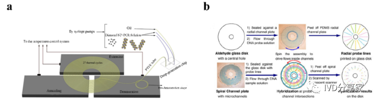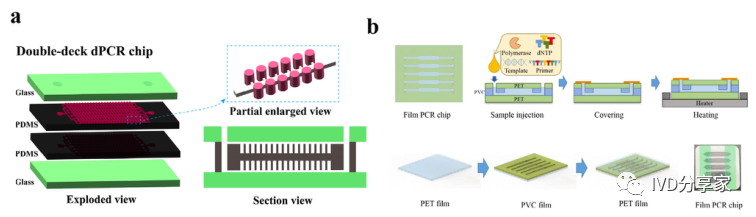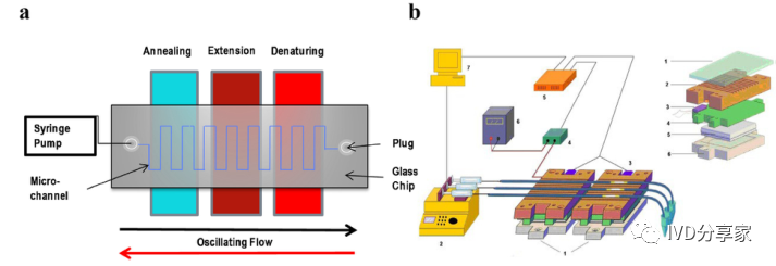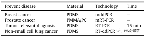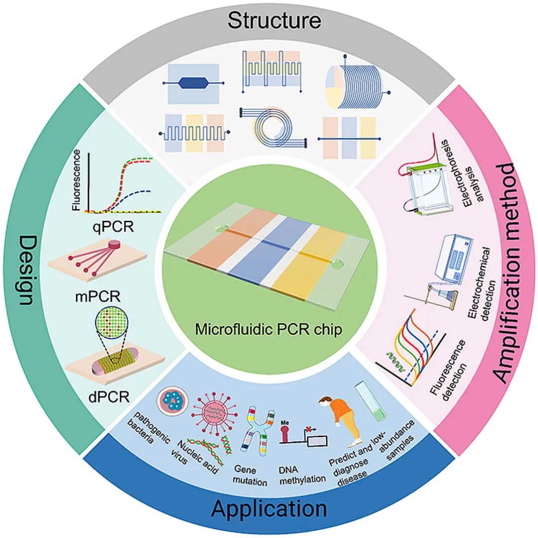 微流控PCR芯片概览 2、结合qPCR的微流控芯片 3、结合mPCR的微流控芯片 4、结合dPCR的微流控芯片 ddPCR技术将PCR反应液分成大量的纳升至皮升,同时在这些小液滴中进行PCR扩增,分析扩增后液滴的荧光信号,计算出目的基因的拷贝数。以液滴为反应单元的PCR系统系统结构更简单,成本更低,结果更准确。Chen等人使用水相通过微通道阵列分散成稳定的油包水乳液液滴,并进行高动态范围的dPCR反应。事实证明,这种经济有效的方法不仅节省了复杂的微流控设备和控制系统,而且大大抑制了材料损失和交叉污染。此外,Wang等人使用压缩空气驱动流体产生液滴,无需外部微阀即可实现实时监测。该系统只需要一个恒温加热器即可实现dPCR所需的稳定热循环,实现每个热循环中液滴荧光的实时检测,简化了传统的dPCR过程。 在现有的一些ddPCR系统中,液滴发生器产生液滴后,需要将液滴转移到其他模块进行扩增和检测,可能会导至转移过程中液滴丢失,结果不准确。在转移过程中存在交叉污染的风险。如张等人采用喷墨打印技术,在油相中产生单分散液滴,然后稳定分散到毛细管中,简化了乳化过程,大大减少了试剂的损失,且生成的液滴在不同温度下是连续的。该方法应用于携带目标DNA的阳性液滴,并利用该系统对三个数量级不同数量的DNA进行定量评估。Wei等人开发了一种新型 dPCR 芯片,它将液滴产生、液滴阵列自组装、PCR 扩增和荧光检测集成到一个设备中。它的特点是制造成本极低、定量能力强且有小型化的潜力,满足DNA分子定量标准。 随着微流控技术的成熟,基于微流控技术的dPCR技术发展迅速。两者结合可以避免繁琐的样品分散操作,在短时间内自动形成一大型的独立反应单元,通量高,提高了准确度和灵敏度。与传统的qPCR技术相比,dPCR技术具有极高的灵敏度、精密度和特异性,特别适用于细微的拷贝数变异、稀有基因突变和核酸绝对定量。广泛应用于医疗、微生物检测、食品安全等领域。 微流控PCR芯片的结构类型 不同样式的微流控PCR芯片的示意图。红色表示变性,蓝色表示退火,黄色表示延伸 1、Micro-chamber PCR chips 3、Spiral microchannel PCR chips 4、Oscillating-flow PCR chips 5、 Closed-loop PCR chips 6、Straight channel PCR chips 7、Others PCR chips 微流控PCR芯片的应用 随着微流控技术的快速发展,微流控PCR芯片正朝着结果简单、功能集成、便携和一次性的方向发展。微流控PCR芯片现在被用于识别病原体、核酸病毒和基因突变,以及预测和诊断疾病和检测低浓度样品。COVID-19正在席卷全球,尤其是现在。我们的共同目标是创造既便携又集成的核酸检测技术。微流控PCR芯片技术的进步,赋予了生物、医学等领域巨大的应用价值。 1、与病原体检测相关的微流控PCR芯片 2、与核酸病毒检测相关的微流控PCR芯片 3、基因突变检测相关的微流控PCR芯片 4、与疾病预防和诊断相关的微流控PCR芯片 5、与DNA甲基化检测相关的微流控PCR芯片 6、与低丰度样品检测相关的微流控PCR芯片 结论和未来展望 尽管典型的PCR反应过程简单明了,化学扩增效果明显,但对硬件条件的依赖仍然是PCR广泛使用的一个重要障碍。提高热循环率、最小化设备和使用更少的化学品需要进一步开发。传统的台式热循环仪仪器体积大,试剂消耗大,导至系统热容量增加,进而降低了温度转变速率和反应速率。这些缺陷可以通过PCR设备的小型化来解决。近几十年来,微流控PCR设备的发展有了很大的进步,改变了传统的核酸扩增PCR方法体积大、成本高、耗散大、易污染和降解等问题。热传导速度加快,提高了热循环的效率。 微流控PCR已与多种检测方法相结合。其中,荧光检测是最灵敏、最方便的检测方法。开发低成本、高通量、高速的检测方法是未来研究的重点。系统集成和自动化可以减少手工操作、减少交叉污染及试剂和样本消耗。在COVID-19的趋势下,集自动化和小型化于一体的检测平台是未来的发展方向。 本综述讨论了PCR技术(PCR、RT-PCR、dPCR、mPCR)与微流控芯片上各种通道结构的结合,并介绍了相关的检测方法。还总结了一些已报道的生物分子分析应用,由于芯片加工制造平台还不够普及,微流控PCR技术设备仍需要更好的改进。核酸提取、扩增和检测的一体化将是未来研究的重要方向。 本研究得到国家自然科学基金面上项目(81973569, 21727814, 21621003, 82130113)、四川省科技厅重大专项(2019YFSY0046)、四川省科技厅区域创新合作项(2020YFQ0032)等资助。 原文链接:https://doi.org/10.1016/j.trac.2022.116737 |