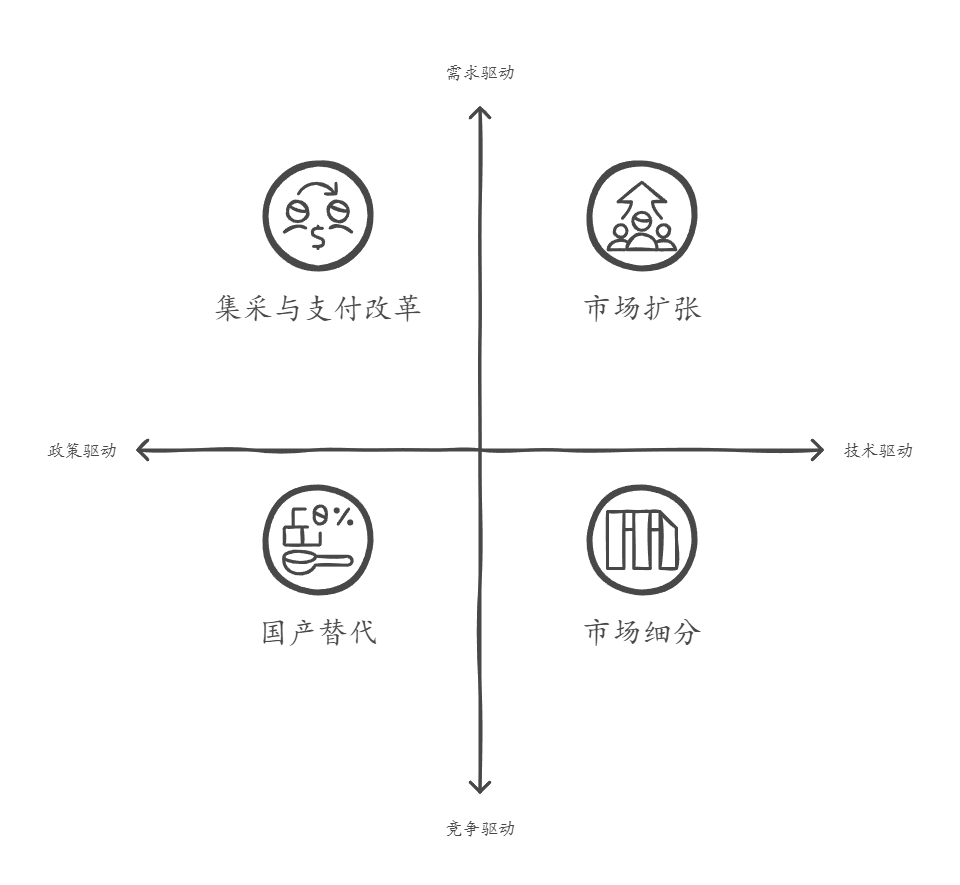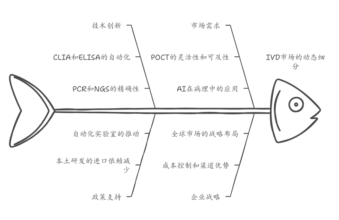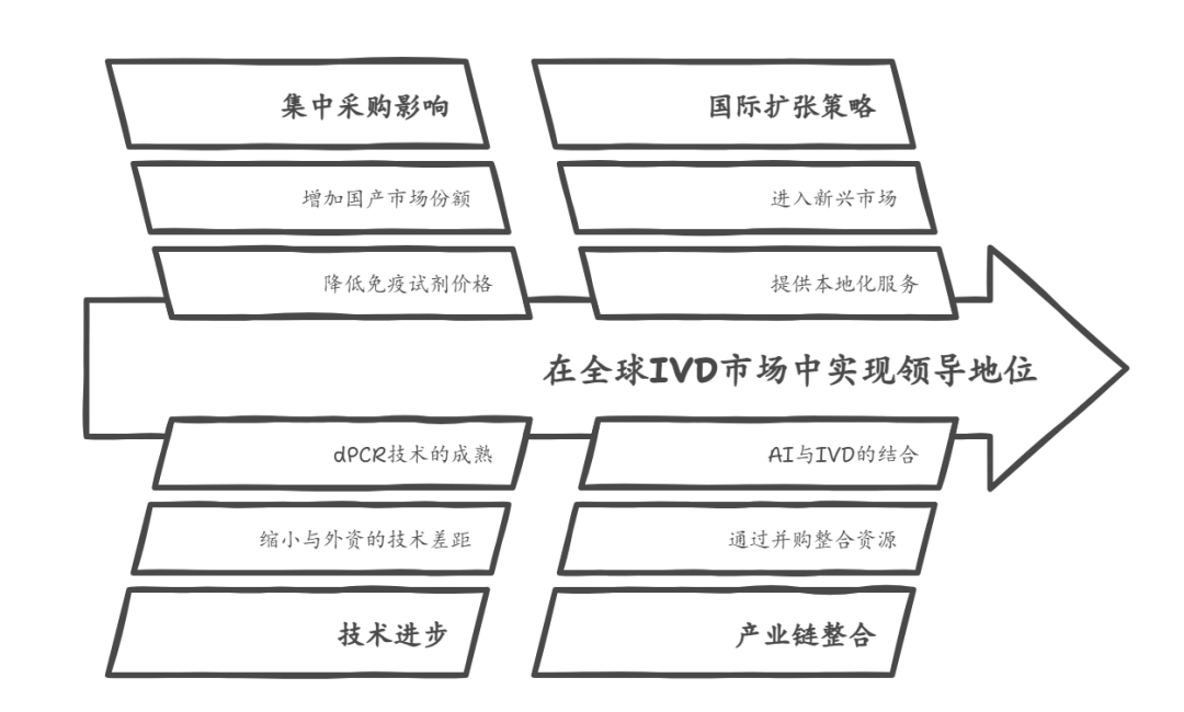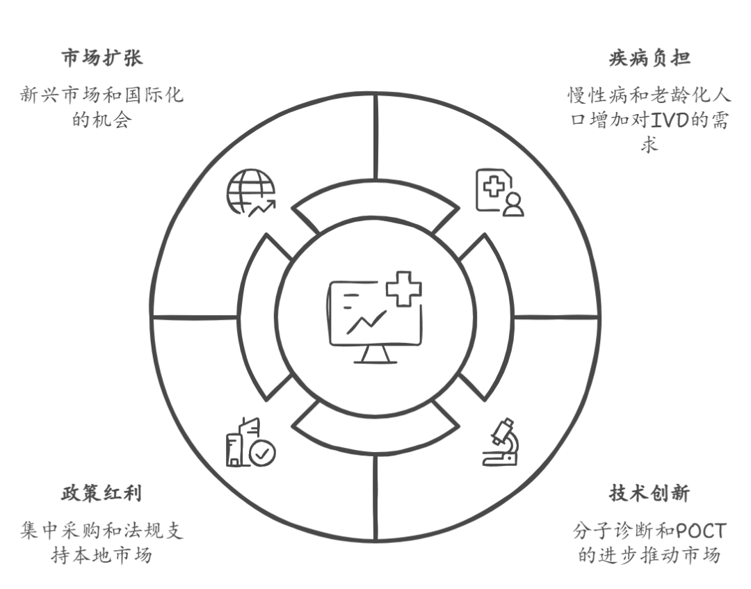 政策驱动集采与支付改革、技术驱动细分市场分化、需求驱动市场扩张、竞争驱动国产替代与国际化。 2025年我国IVD行业将经历重大变化,这些变化受政策、技术、需求和竞争的多重影响。全球医疗健康的需求在上升,同时国内医疗改革深入进行,IVD行业面临着重大的挑战。随着全球人口老龄化和慢性病、传染病的增加,对于高效精准诊断技术的需求变得更加紧迫。政府在推进医疗体制改革方面积极行动,通过集中采购与医保支付改革等政策来降低医疗成本,提高服务的可及性与质量。在这种背景下,IVD行业作为医疗健康产业的重要环节,对于整个体系承担着重要责任。 在政策方面,国家医保局持续推动集中采购药品与医用耗材,这对IVD领域同样有影响。这一政策改变了传统采购方式,同时也为IVD企业在成本控制、产品研发和市场策略上带来了新挑战。医保支付方式的改革也在加速,DRG/DIP支付模式的推广使医疗机构更加关注成本与效率,对IVD产品的使用影响巨大。同时,国家对医疗行业监管加强,IVD产品的质量、安全与有效性受到重点关注。在技术方面,IVD行业经历了快速的技术更新与创新,免疫诊断、分子诊断和POCT等技术发展,使疾病早期诊断与精准治疗成为可能。比如,CLIA技术进步显著提高免疫诊断的灵敏度;NGS技术的应用为肿瘤与遗传病的诊断提供了新思路;POCT技术的普及则促进了快速诊断与基层医疗服务的可行性。在需求方面,老龄化、慢性病的增加和传染病的防控压力共同推动IVD市场扩张。老年人对慢性病管理需求增加,公众健康意识的提升使更多人主动关注健康筛查和预防。
