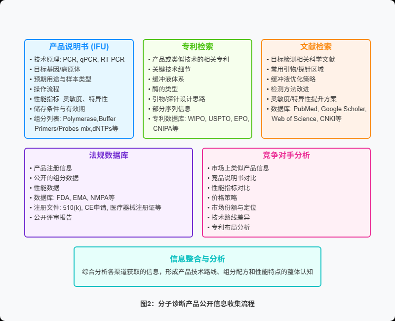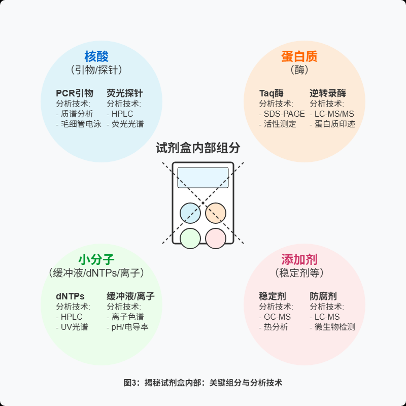 在探讨技术之前,有几项前提必须明确。首先合法合规是绝对的底线,进行任何反向工程都不能侵犯他人知识产权。在此的讨论仅限于技术层面的探讨,任何实际操作都必须严格遵守相关的法律法规和职业道德规范。其次必须认识到反向工程并非万能的复制,它很难做到百分之百完美地复制,特别是对于其中可能包含复杂稳定剂、特殊添加剂等,以及各种组分之间精确的浓度比例。通常情况下,通过反向工程能够得到的是一个“最接近的模仿品”。再者对资源和专业能力有着极高的要求,需要分子生物学、生物化学及分析化学实验室以及专业团队。最后安全第一位,所有实验操作必须严格遵循实验室安全操作规程。 明确了这些前提与潜在的局限后,来确定反向工程的具体目标。它主要是为了探明目标试剂的几个核心问题:其一,关键组成成分是什么?例如,使用了哪种类型的酶?引物和探针?其大致的序列结构是怎样的?其二,这些成分的大致含量或浓度比例是多少?其三,配方策略以及生产工艺上有哪些特点?为了更具体地说明,不妨以当前应用广泛的,基于PCR/qPCR技术的核酸检测试剂为例,逐步解析这个“拆解”过程大致包含的步骤。 整个探索过程的第一步,通常是从外围信息入手,进行广泛的资料搜集与初步的样品检查,这好比侦探破案前期的线索排查。需要仔细研究产品说明书从中获取技术原理、检测的目标基因或病原体、预期用途、适用的样本类型、操作流程、标称的性能指标、储存要求、有效期,以及成分列表(尽管这里通常只给出成分的大类名称)。除了说明书,还需要在专利数据库中检索该产品或相关技术的专利信息,其中可能隐藏着缓冲液体系、所用酶的具体类型、引物/探针的设计思路甚至部分序列等关键细节。同时,查阅相关的科学文献,可以了解该检测领域常用的引物/探针设计区域、缓冲液优化策略等背景知识。查询相关的法规数据库,有时也能找到产品注册时公开的部分组分或性能数据。此外,对市场上同类竞争产品的分析,也能提供有价值的参考信息。在信息收集之外,还需要对获取的试剂样品进行初步的理化性质检查,比如观察其外观物理状态(液体还是冻干粉?颜色?透明度?粘稠度?有无沉淀?)、测定其pH值(反映缓冲液体系的关键指标)、测定渗透压(溶液整体溶质浓度),以及进行基础的紫外-可见光谱(UV-Vis)扫描,初步判断是否存在大量蛋白质或核酸,或者是否含有特殊的染料成分。 在完成信息搜集和样品检查后,进入组分的分离与鉴定核心环节,这是技术含量最高的部分,其核心策略是“分而治之”:先将试剂混合物中不同类型的分子有效分离开来,然后再运用各种精密的分析手段,逐一确定它们的身份和大致含量。例如,对于试剂中的无机离子,可以利用ICP-MS/ICP-OES这类技术来精确定量关键的金属离子,如Mg²⁺(镁离子,其浓度对聚合酶的活性影响显著)、K⁺(钾离子,影响引物与模板的结合效率)以及Na⁺(钠离子)等。针对缓冲液成分、dNTPs、稳定剂等小分子化学物质,则需要动用一系列色谱与质谱技术。HPLC 就像一个分子筛,能依据物质的不同性质将其分离;而当HPLC与MS/MS联用时,便构成了当前鉴定小分子结构最强大的工具之一。它能在分离后精确“称量”每个分子,并通过分析其碎片离子来推断其化学结构,从而鉴定出缓冲液的具体组分、dNTPs的种类与含量、以及可能存在的稳定剂(如甘油、PEG、PVP、BSA )、非离子去污剂(如Tween-20、Triton X-100)等。此外GC-MS适用于分析易挥发的有机物,IC用于检测常见的阴离子和某些有机酸,而NMR则能提供详尽的分子结构信息,尤其对鉴定缓冲液和有机添加剂有帮助,但通常对样品量和纯度要求较高。 接下来是对蛋白质组分(主要是各种酶)的分析,在分子诊断试剂中,酶是驱动反应的核心引擎。例如,在检测RNA病毒时需要用到逆转录酶 将RNA模板转化为DNA,然后才能进行PCR扩增。因此,RT酶的性能,如逆转录速度、合成产物的量以及耐热性,直接关系到检测的灵敏度和效率。反向工程的一个重要任务就是鉴定出试剂盒中使用的是哪种或哪类酶。常用的分析技术SDS-PAGE,它可以根据蛋白质的大小将其分离,通过观察电泳条带的位置来估计分子量,初步判断是否存在预期大小的聚合酶、逆转录酶,或者是否添加了大量BSA(约66 kDa)作为稳定剂;蛋白质定量方法(如Bradford法或BCA法)用于测定总蛋白浓度;而LC-MS/MS蛋白质组学技术则被视为鉴定蛋白质具体身份的“金标准”。该技术通常是将蛋白质样品用特定的酶切割成许多小的肽段,然后通过LC-MS/MS分析这些肽段的序列信息,最后在蛋白质数据库中进行比对,从而确定蛋白质的精确类型。此外,还可以通过设计特定的实验来测定酶的活性,以确认其功能类型。如果怀疑存在某种特定的酶并且有相应的抗体,Western Blot 技术可以用来验证其是否存在。 与此同时,对核酸组分(主要是引物和探针)的分析是最具挑战性的部分之一。引物和探针的序列、纯度、修饰方式等质量特性,直接决定了分子诊断检测的准确性和可靠性。现代诊断试剂中常常使用经过化学修饰的探针,例如添加特殊的荧光基团(如FAM、HEX、ROX、Cy5等)用于信号报告,以及相应的淬灭基团(如BHQ、TAMRA等)来控制背景荧光;有些还会采用如LNA或PNA等特殊化学结构来增强其与靶标序列的结合能力或特异性。鉴定这些核酸分子的精确序列和