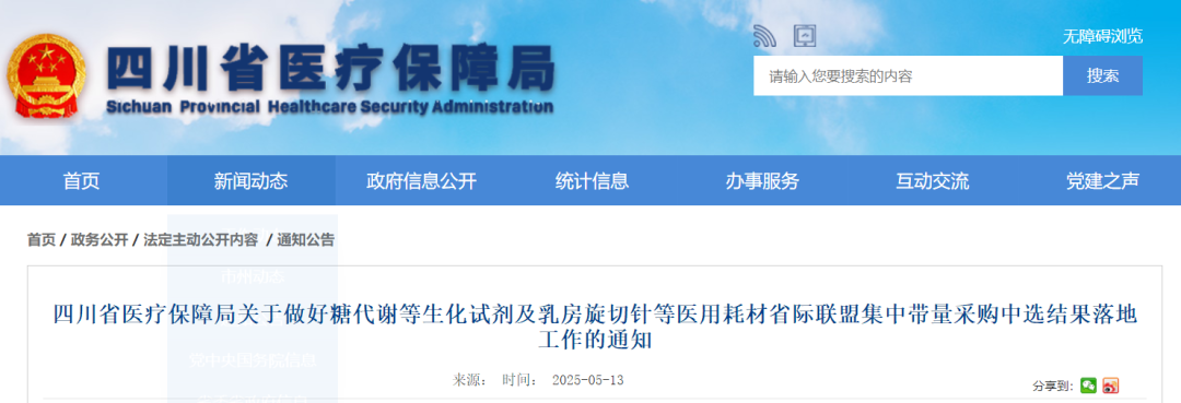 各市(州)医疗保障局,省医疗保障事务中心、省药械招标采购服务中心:为确保江西牵头的糖代谢等生化类检测试剂、天津牵头的肝功能生化检测试剂和血液透析类医用耗材、浙江牵头的乳房旋切针类医用耗材集中带量采购省际联盟中选结果在我省顺利落地执行,根据国家及相关省际联盟采购文件和通知要求,现就做好中选结果落地工作通知如下。(一)执行集采结果。中选产品按中选价格在我省直接挂网。中选企业作为供应保障第一责任人,自主选择配送企业,建立配送网络,履行供货承诺,满足医疗机构临床使用需求。采购周期内医疗机构若提前完成年度约定采购量,对超出部分中选企业仍按中选价进行供应。(二)规范未中选产品挂网。对未中选产品,按照四川省医用耗材集中采购联动参考价规则等相关政策挂网。国家及相关省际联盟采购文件和通知、公告等文件中有明确要求的,按照其要求及价格政策执行。按照我省药械集中带量采购医保资金预付政策的有关规定,对合同约定采购量内的中选产品,由医疗机构书面委托当地医保经办机构使用医保基金,通过省药械集中采购及医药价格监管平台上的药械货款集中支付监管账户预付药品采购货款。在三方购销合同签订15个工作日内,按不低于合同采购金额的50%进行首次预付,并按规定预付剩余货款。(一)做好中选产品供应保障工作。各市(州)及省药械招标采购服务中心要按照《国家医疗保障局办公室关于加强医药集中带量采购中选产品供应保障工作的通知》(医保办函〔2024〕5号)和相关采购文件、通知、公告等要求,压实中选企业履约责任,在采购周期内每年及时组织签订采购协议,健全中选产品供应配送常态化监测机制,畅通医疗机构反馈问题渠道,做好中选产品供应情况监测。(二)督促中选产品合理使用。医疗机构是中选产品配备使用的责任主体,各市(州)医疗保障部门及省药械招标采购服务中心要督促医疗机构强化履约责任,通过省药械集中采购及医药价格监管平台有序进行采购,并优先采购和使用中选产品,确保按时完成约定采购量。京津冀联盟血液透析类医用耗材:2025年5月22日;浙江联盟乳房旋切针类医用耗材:2025年6月12日;江西联盟糖代谢等生化类检测试剂、京津冀联盟肝功能生化检测试剂:2025年6月20日。(二)具体中选结果等由省药械招标采购服务中心另文公布。其余价格管理、采购周期等未尽事宜,按照国家及相关省际联盟采购文件、公告及通知执行。医保支付、医疗服务价格、供应使用等按照国家和我省相关文件执行。