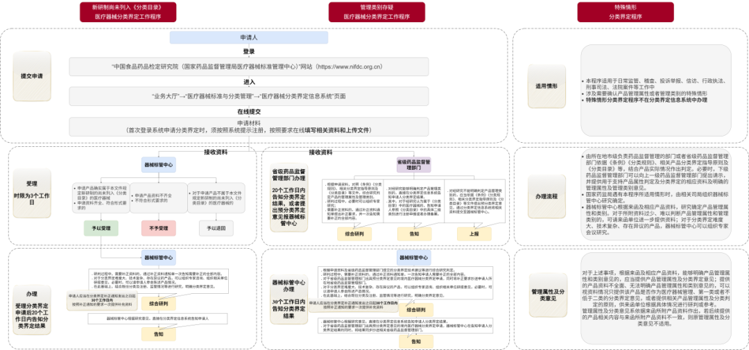 注:1.本表中“Ⅰ”、“Ⅱ”、“Ⅲ”分别代表第一类、第二类、第三类医疗器械; 2.本表中“-”代表不存在这种情形。 ③《分类目录》按技术专业和临床使用特点分为22个子目录。判定产品的管理类别时,应当根据产品的实际情况,结合新《分类目录》中产品描述、预期用途和品名举例进行综合判定,产品描述和预期用途是用于判定产品的管理类别,不代表相关产品注册内容的完整表述。《分类目录》不包括体外诊断试剂,不包括组合包类产品。 ④分类规则征求意见稿,应该是基于近年来产品申报的情况,进行了语言表述的调整和技术内容的细化。 05 分类界定相关法规及经验 主要依据内容是《医疗器械监督管理条例》中第二十三条的内容,法规原文参考前文,在这里不在赘述。 相关法规: