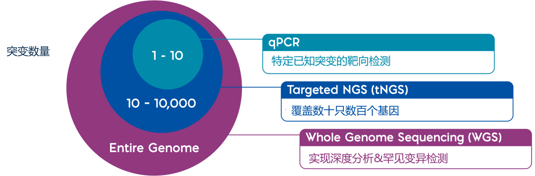 随着这些技术日趋成熟,诊断试剂的开发者面临着平台选择、检测方案设计以及试剂优化等多方面的复杂决策。这些决策不仅直接影响检测性能与合规审批进度,也决定了这些技术在中心实验室和POCT 等不同应用场景中,能否真正实现广泛可及与成本可控的癌症精准诊断。 肿瘤生物学的进展不断揭示传统诊断手段(如组织学和免疫组化)的局限性,促使临床决策逐步转向以分子特征为导向的新范式。这一趋势正在重新定义医生对肿瘤的分类与治疗方式。 在过去二十年中,大规模的癌症基因组研究³⁻⁴揭示了多种癌症中的关键驱动突变、信号通路以及分子亚型,进一步暴露了许多原本被视为同质性肿瘤背后的异质性特征。这一认知的转变凸显出对“分子级”精确诊断的迫切需求——诊断技术不仅要灵敏可靠,更需捕捉具有临床意义的基因变化。 qPCR最早满足了这一需求,它能高灵敏地检测特定的、可用于治疗决策的突变,成为现代伴随诊断(CDx)技术的基石。 随后, tNGS的出现极大拓展了分子诊断的广度,使临床可以在一次检测中对数十至上百个与癌症密切相关的基因进行多重分析,从而提升突变谱分析的全面性与靶向治疗方案的精准性。 近年来,随着测序平台(包括短读长读技术)及建库流程的优化,WGS也逐步实现了临床应用的可行性,使得对整个肿瘤基因组的高准确度覆盖成为现实。虽然目前WGS尚未在临床中大规模普及,但其作为全面肿瘤特征解析的重要工具,正在不断显现价值,特别是在识别罕见、复杂或新型基因改变方面显示出独特优势。 不同技术在突变和基因组检测覆盖率上的不同 总体而言,虽然多项技术共同推动了癌症诊断的演进,但qPCR、tNGS与WGS无疑是实现精准肿瘤学临床落地的三大核心引擎——它们将分子诊断从研究工具转变为现代肿瘤治疗体系的关键支柱5 。 如今,分子诊断技术已覆盖癌症诊疗的整个周期——从早期筛查到治疗后的残留病监测,均发挥着至关重要的作用。借助液体活检等技术,医生可以通过血液、唾液或尿液等微量样本检测ctDNA及其他肿瘤标志物,实现更早期、更准确的癌症识别。 一旦确诊,qPCR和tNGS等肿瘤分子分型技术则进一步解析肿瘤的分子亚型,识别可供靶向的基因突变,从而为个体化治疗方案提供精准指导。 在治疗过程中,分子诊断还能通过血液中的生物标志物和动态基因组变化,实时监测患者对治疗的响应;治疗结束后,基于ctDNA和MRD检测的持续监测手段,可在临床症状出现之前,及早发现肿瘤复发的迹象。 这种通过分子数据引导“动态调整治疗强度”(包括加强或减轻治疗强度)的能力,不仅提高了治疗效果,也支持将癌症转变为一种可长期管理的慢性疾病,而非不可逆的终末期诊断⁶。 精准肿瘤学在癌症临床中每个阶段的应用 分子诊断在癌症治疗中的广泛应用,得到了大量循证研究的有力支持。这些研究明确表明:基于基因组信息指导治疗,能够显著改善临床结局并延长患者生存期。 例如,非小细胞肺癌(NSCLC)中的BATTLE-2试验⁷,以及转移性结直肠癌的相关研究⁸均表明:以生物标志物为依据的靶向治疗策略,能够获得更好的治疗响应率。 更大规模的AACR GENIE联盟所开展的人群分析⁹进一步证实,在接受“靶向治疗与突变类型相匹配”治疗方案的患者中,中位生存期显著延长。 这些研究成果不仅验证了分子诊断在当前临床实践中的实际疗效,也强调了其未来发展潜力:随着分子技术的持续进步,精准治疗将进一步深入推进,不仅延长患者生命,还将支持“癌症慢病化”管理模式的建立和推广。 对于诊断试剂开发者而言,要同时满足临床需求与运营效率,必须在分析性能、成本效益与使用便捷性之间寻找最佳平衡。精准肿瘤学的发展依赖于高度准确的技术手段,用以识别关键基因变异、指导治疗决策,并确保在不同医疗场景中都能可靠解读和应用检测结果。 在当前的市场格局中,三种核心分子技术——qPCR、tNGS与WGS已成为主流。这些技术构成了绝大多数已获监管批准的肿瘤诊断产品的基础,因其在临床适用性、可扩展性以及成熟的合规路径方面具备显著优势¹⁰-¹¹。 然而,不同技术之间存在重要差异,开发者需根据检测产品的预期用途谨慎选择: