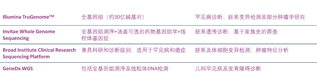 从产品开发角度来看,tNGS 面板具备良好的可扩展性,可根据新兴生物标志物的发现灵活升级。这一特性使其特别适合用于肿瘤分型、靶向治疗选择、和MRD监测等临床场景。 不过,tNGS 的实施仍面临一些挑战,如对高质量生物信息学支持的依赖,样本质量不佳时的技术局限,相对较长的检测周期,尤其是在资源有限或分散式检测环境中¹⁵,²⁰。 尽管如此,tNGS 在基因组覆盖范围、分析深度与临床可行性之间达成了良好平衡,是当前精准肿瘤学中兼顾性能与灵活性的核心技术平台。 表2. 临床上使用tNGS技术已获得FDA批准的精准肿瘤学检测 🌀 WGS:洞察全貌,受限于可及性 WGS是目前信息最全面的分子诊断技术,可在无偏倚的前提下,对全基因组范围内的所有突变类型进行检测,包括:单核苷酸变异、插入/缺失、拷贝数变异、结构重排、非编码区突变等²¹-²²。 WGS 尤其适用于发现新型生物标志物、解析复杂肿瘤亚型、以及识别耐药机制,为肿瘤研究与精准医疗带来了前所未有的深度与广度。 然而,尽管其科研价值巨大,WGS 在常规临床诊断中的应用仍相对有限,主要受制于以下几个关键障碍: