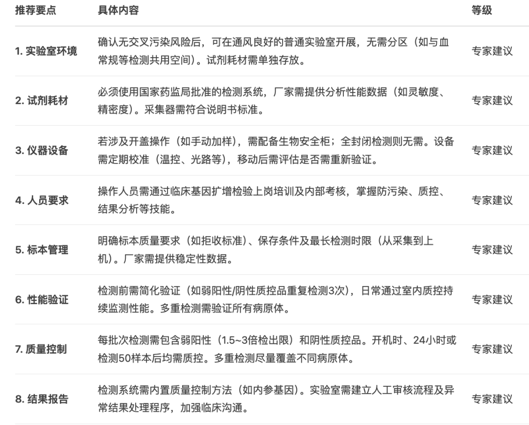 简化实验室要求:通过验证密闭性,允许在非分区实验室开展检测,降低基层应用门槛。 动态质控策略:结合简化性能验证和持续室内质控,平衡效率与质量。 多重检测规范:针对多重PCR提出分病原体验证、质控覆盖等具体要求。