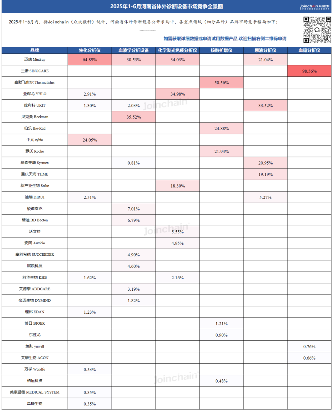 近日,众成医械发布2025年1-6月河南省体外诊断设备市场竞争全景图。其中迈瑞生化分析仪以64.89%占有率断层领先,血液学分析设备、化学发光免疫分析仪、尿液分析仪等也有不俗的竞争力。 图源:众成医械