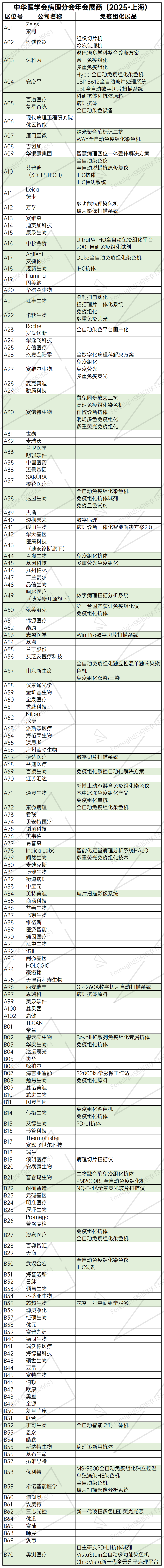 病理诊断方法可以分为: 组织病理(细胞组织形态结构) 细胞病理(细胞水平) 免疫组化病理(蛋白水平) 分子病理(核酸水平) 免疫组化是根据抗原和抗体结合的高特异性,以特异性抗体去探测组织或细胞中同类的抗原物质,进而对组织或细胞中未知抗原进行定性、定位或定量研究。 免疫组化的主要临床应用包括恶性肿瘤的诊断与鉴别诊断、确定转移性恶性肿瘤的原发部位、对某种肿瘤进行进一步的病理分型、软组织肿瘤的组织学分类、发现微小转移灶、为临床提供治疗方案等。伴随诊断是免疫组化的一个重要应用领域。 (以上摘录于《2022体外诊断科技创新发展报告》) 有多少免疫组化病理产品公司? 我们来看看2025年中华医学会病理学分会的病理年会的参展商。 根据会议资料,申报参展企业172家。 其中涉及免疫组化试剂、染色机、扫描仪的企业,据不完全统计,有接近40家。(见下表绿色部分) 现代医学(尤其是肿瘤学)已从“单一靶点驱动”转向“多组学+空间表型”的精准诊断模式。 多重免疫组织化学 (Multiplex Immunohistochemistry, mIHC)是一种在同一张组织切片上同时检测多种抗原的先进技术,通过不同荧光染料或显色标记区分目标蛋白,结合高分辨率成像系统实现多指标的空间分布分析。相较于传统单重IHC(仅检测单一指标),其核心优势体现在以下方面: 一、提升诊断效率与样本利用率传统单重IHC需对同一组织样本进行多次切片、多次染色(每次检测一种指标),不仅耗时(需重复抗原修复、封闭等步骤),还可能导至样本损耗(尤其对珍贵临床样本和稀有病例样本)。 mIHC,仅需1次切片和染色流程即可同时标记多种目标蛋白(如肿瘤标志物、免疫细胞标记物、血管生成因子等),大幅减少样本消耗。避免重复操作,大大缩短时间。 二、保留空间位置信息,解析组织微环境传统单重IHC仅能提供单一蛋白的表达强度或阳性率,但组织的生物学功能依赖于细胞间的空间互作(如肿瘤细胞与免疫细胞、基质细胞的接触,血管周围浸润等)。多次单重检测会破坏组织的空间结构(如重复切片导至层间错位),无法还原真实微环境。 mIHC,在同一切片上直观呈现多种蛋白的空间共定位关系,如PD-L1+肿瘤细胞与CD8+ T细胞的邻近程度、肿瘤血管周围FoxP3+调节性T细胞的浸润密度。 可用于分析肿瘤免疫微环境(TIME, Tumor Immune Microenvironment)中的复杂交互,如“热肿瘤”(高PD-L1表达+密集CD8+ T细胞浸润)与“冷肿瘤”的区分,或评估肿瘤干细胞与微环境支持细胞的关联。 三、多维度生物标志物整合,助力精准诊疗单重IHC仅能提供单一维度的信息(如HER2过表达)。 mIHC,可整合蛋白表达水平、空间分布、细胞表型等多维度数据,形成更全面的生物标志物谱。 通过多指标组合,如“HER2+Ki-67+ER+PR”的乳腺癌分子分型)或“评分系统”(如肿瘤浸润淋巴细胞TILs的密度+空间分布),提高诊断/预后判断的准确性。 多重IHC通过“单张切片+多指标+空间信息”的核心能力,在临床诊断(提升效率与准确性)、基础研究(解析微环境互作)及转化医学(加速标志物发现)中展现出不可替代的价值。随着技术进一步成熟(如更高通道数的标记、更精准的空间定量算法),其应用场景将从肿瘤扩展至神经退行性疾病、自身免疫病等更广泛领域,成为精准医学的关键技术支撑。 |