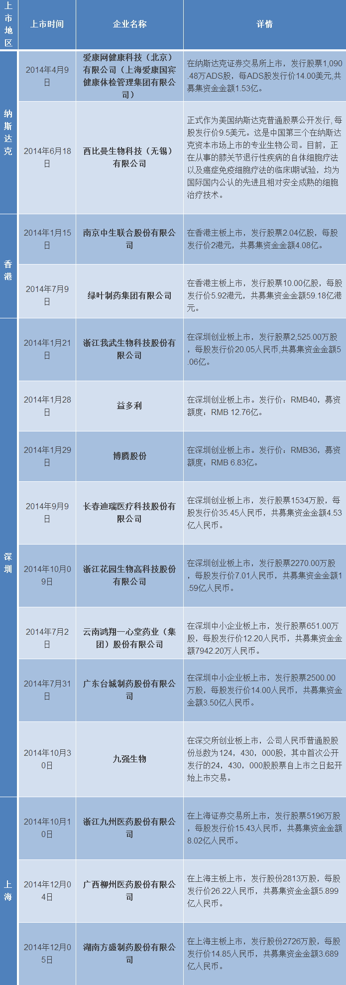 企业上市,能广泛吸收社会资金,迅速扩大企业规模,提升企业知名度,增强企业竞争力。 世界知名大企业,几乎都是通过上市融资,进行资本运作,实现规模的裂变,迅速跨入大型企业的行列。 例如,美国500家最大公司的95%是上市公司,具销售额占全美销售额的68%,对美国经济有着举足轻重的影响。 近几年,医药健康界正风起云涌,业内公司竞相上市,在此,我们为大家盘点了2014年陆续上市的医药健康领域公司: