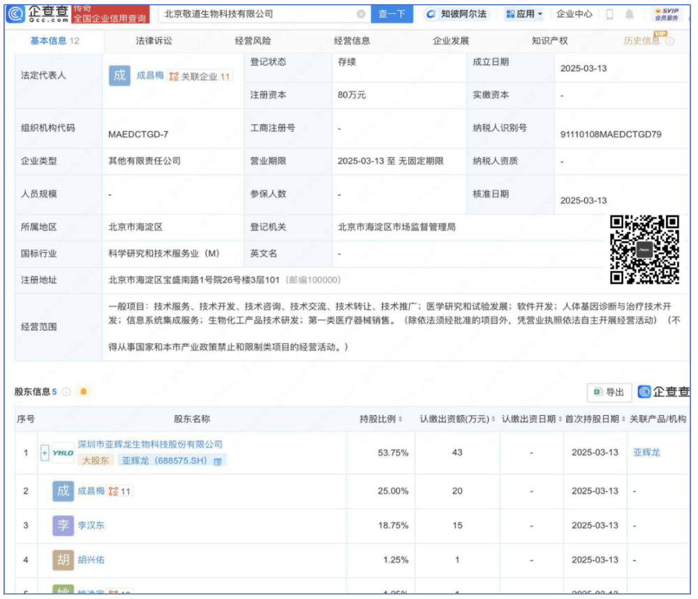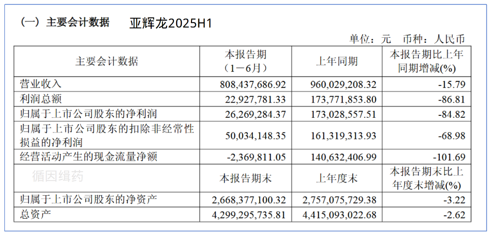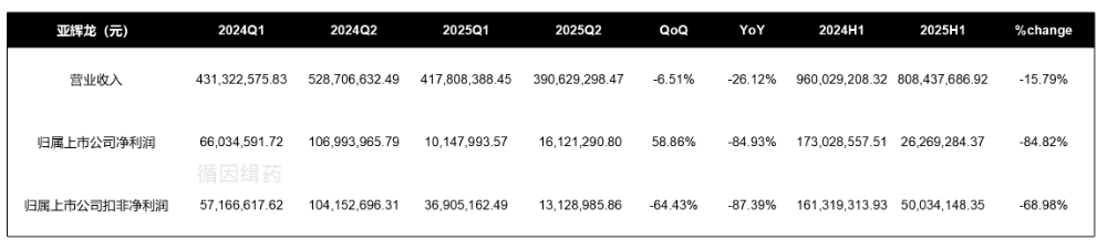 不过,之前聊过他们家的“大道测序”还追问过到底这测序仪项目是停了没停。真不是故意找茬,纯粹是关心行业发展,顺道看一眼亚辉龙2025H1的财报。2025年3月,亚辉龙在北京成立了一家新的公司:北京敬道生物科技有限公司。结合此前朋友们的留言以及公司主营业务,我们有理由相信,北京敬道很可能就是亚辉龙测序仪开发主体之一。就是不敢确定到底是放弃了深圳大道测序还是另开战场。这里面,有个关键人物是李汉东博士,他曾担任华大生命科学研究院化学研究所所长。在华大智造上市时,也曾披露他是员工持股平台深圳家华的合伙人。我们关心的测序仪项目也仍然在进行中,本期投入金额1618.35万元,相较于去年同期投入的2887.47万元减少了43.95%。只是,不知道是开发阶段问题还是说确实就是在缩减开支,控制节奏。2025H1营业收入8.08亿元,同比下滑15.79%;归母净利润2626.93万元,同比下滑84.82%。扣非归母净利润5003.41万元,同比下滑68.98%。单纯把2025Q2拎出来也是一样惨淡,营收3.91亿元,同比下滑26.12%,归母净利润1612.13万元,同比下滑84.93%。营收下滑速度大于成本削减速度,且销售费用还在攀升,难呢。研发人员较去年同期减少了63人,推算总员工数量1678人,相较于去年同期减少98人。如果以2024年年底1753人为基数,则是减少了75人。2025H1亚辉龙海外自产主营业务营收达到1.29亿元,同比增长26%。大道尚存,而此处灵气稀薄,不若去那海外仙山再寻机缘。相关资料: