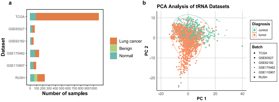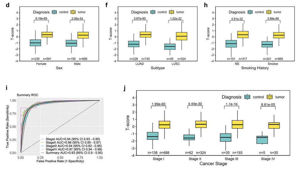 肺癌是全球癌症相关死亡的主要原因,其中非小细胞肺癌(NSCLC)占比达85%。NSCLC具有较高的早期转移风险,在美国人口中,其5年生存率仅为28%。现有的诊断方法(如CT扫描和组织活检)存在辐射风险、假阳性率高和侵入性等局限性。因此,迫切需要创新无创、准确的肺癌早期诊断方法。液体活检通过分析血液中的循环肿瘤标志物(如外泌体RNA)提供了新思路。循环肿瘤细胞、DNA和外泌体已被确定为液体活检中的关键生物标志物。tRNA(Transfer RNA)作为蛋白质合成的关键分子,近年被发现其表达谱在癌症中异常,且其衍生片段(tRFs)可能参与肿瘤代谢调控。然而,tRNA作为诊断标志物的潜力尚未充分挖掘,其与外泌体的关联机制亦不明确。 近日,杂志communications medicine上发表了一篇题为“Liquid biopsy diagnostics for non-small cell lung cancer via elucidation of tRNA signatures”的文章,在这项研究中,作者通过采用基于机器学习的方法,利用来自多个全球NSCLC队列的小RNA测序数据成功识别了一个六tRNA诊断特征,并在独立的血液外泌体数据集中验证了该tRNA特征的诊断性能。此外,三个特征tRNA还显示了独立生存预测的预后价值。功能研究提示特异性tRNA及其相关片段在肿瘤代谢途径中的潜在调节作用。 图片来源:Communications medicine 主要内容 tRNA有望成为肺癌检测诊断特征 作者对包含1679个样本的数据集进行了全面分析,整合了1446例组织样本(来自TCGA、GEO等公共数据库)和233例血浆外泌体样本(来自RUSH医学中心)(图a)。主成分分析(PCA)显示,对照组和肿瘤组之间tRNA表达谱存在显著差异(p=2.2×10−16),突出了tRNA作为癌症检测的鉴别标记的潜力(图b)。 tRNA可成为肺癌检测诊断特征。 图片来源:Communications medicine 6-tRNA标志物的诊断性能 通过比对肿瘤样本中与对照组,作者鉴定出由4个上调 (tRNA-Val-CAC-2-1, tRNA-Leu-AAG-2-3, tRNA-Val-CAC-1-5和tRNA-Lys-CTT-3-1)和2个下调(tRNA-Ala-TGC-3-2和tRNA-Asp-GTC-1-1)tRNA组成的标志物。这组标志物在组织样本中AUC达0.97(发现数据集)和0.96(验证数据集)(图a,d);在独立验证集外泌体样本中的AUC为0.84(图g),在区分恶性和良性疾病方面有着很高的准确性。总之,6 - tRNA特征已经在多个阶段和数据集上被成功识别和验证,突出了其作为检测NSCLC的可靠特征的潜力。 不同阶段6-tRNA特征的性能评价。 图片来源:Communications medicine 6 - tRNA特征t评分的跨人群稳健性 研究队列人群具有不同年龄、性别、组织学亚型、AJCC病理分期和吸烟史,作者评估了不同类别样本中6 - tRNA特征t得分的稳健性。整合来自TCGA和RUSH数据集的结果显示,t评分在不同年龄人口统计数据中始终表现优异,AUC值为0.86,没有单个年龄组的AUC低于0.83。同样,综合所有可用数据集的数据,t评分在不同性别、组织学亚型和吸烟状况下都具有一致的高诊断性能(图d-h)。对不同AJCC病理分期的t评分在诊断早期(I期和II期)和晚期(III期和IV期)非小细胞肺癌方面具有高诊断性能,每个阶段的AUC值都不低于0.94(图i)。 总之,t评分作为非小细胞肺癌诊断的潜在独立生物标志物,超越了性别、年龄组、组织学亚型、吸烟史和病理分期的差异。 6 - tRNA特征t评分的跨人群稳健性。 图片来源:Communications medicine 三个tRNA具有预后价值, 能够成为独立的预测因素 作者鉴定出6个tRNA特征中的3个tRNA-Lys-CTT-3-1、tRNA-Val-CAC-2-1和tRNA-Leu-AAG-2-3显示出显著的预后价值。这三种tRNA的表达升高与更高的死亡风险有关,突出了它们作为肺癌独立预后生物标志物的潜力。tRNA-Lys-CTT-3-1的风险比(HR)为1.37,tRNA-Val-CAC-2-1的风险比为1.33,tRNA-Leu-AAG-2-3的风险比为1.30。整合3个tRNA的评分可独立预测生存(HR=1.44),低风险组中位生存优势约为3年(图d)。 三个tRNA是独立的预测因素。 图片来源:Communications medicine tRNA通过tRFs调控肿瘤代谢 通过与mRNA分子的相互作用,tRNA片段(tRFs)在肿瘤发生的转录后过程中成为重要的调节因子。作者研究发现69个tRFs在恶性和非癌样本中有显著差异表达,其中两个上调的tRF,5 ' -tRF-Val-CAC-2-1和5 ' -tRF-Val-CAC-1-5,是从6-tRNA标志物的衍生片段。5’-tRF-Val-CAC-2-1等片段与母体tRNA表达高度相关(r=0.78)。KEGG通路富集分析发现6条重要通路显著富集,显著富集于代谢通路(如氧化磷酸化、嘌呤代谢),这些通路与患者生存显著相关(如氧化磷酸化HR=1.23)(下图e)。 总之,研究结果表明,tRNA通过加工成tRF并影响mRNA稳定性和翻译调控,在调节非小细胞肺癌肿瘤发生的关键代谢网络中发挥重要作用。 tRNA通过tRFs调控肿瘤代谢。 图片来源:Communications medicine 总结与讨论 本研究分析了来自多个研究的小RNA测序数据,确定了一个用于非小细胞肺癌诊断的6- tRNA特征。该研究通过多中心、多阶段验证,确立了tRNA标志物在NSCLC诊断和预后中的价值,并阐明了其表观遗传调控机制。在发现队列中实现了0.97的AUC值,在独立验证集中实现了0.84的AUC。该特征有效地区分了癌变样本和良性样本(AUC = 0.85),并且在临床和人口统计学变量中表现一致,即使对于早期肺癌诊断AUC值也超过0.80。此外,三个特征tRNA还显示了独立生存预测的预后价值。功能研究提示特异性tRNA通过加工成tRF在肿瘤代谢途径中的潜在调节作用。未来需结合前瞻性临床试验推动临床应用,同时深化tRNA在肿瘤代谢中的基础研究。 |