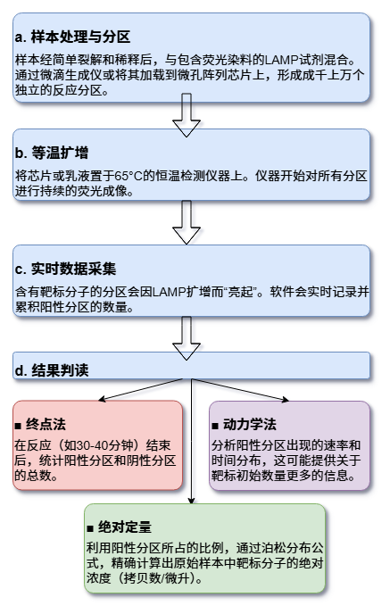 该技术通过将样本分割成数以万计的独立微反应单元,实现了对单个核酸分子的“是/非”判断,最终通过统计阳性单元的数量来完成绝对定量。
