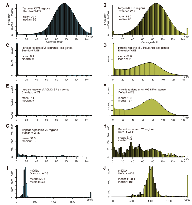作者采用标准基因组DNA样本HG001和HG002,对标准WES和扩展WES的覆盖率进行了比较。结果显示,扩展WES在CDS区域的平均覆盖深度比标准WES仅降低10.0%(图A、B)。对于内含子和UTR,相比标准WES大部分未被检测到,扩展WES深度≥10的覆盖率也能达到85%以上(图C-F)。在70个重复区中,约50%可被WES的覆盖,扩展WES的覆盖率增加到85%以上(图G, H)。对于线粒体DNA,扩展WES覆盖率轻易可达到100%(图I, J)。