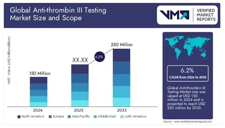 Verified Market Reports 2025 年发布的数据显示,2024 年全球抗凝血酶Ⅲ(Antithrombin Ⅲ)检测市场规模约 1.5 亿美元,预计 2033 年将增至 2.5 亿美元,期间复合年增长率达 6.2%。作为血液学领域的核心检测项目,AT-Ⅲ检测的应用场景远不止于单一疾病 ——它既能帮助临床医生评估遗传性血栓发生风险,也能监测抗凝治疗中的获得性凝血障碍,覆盖心血管、肝病、外科手术等多个关键医疗场景,其市场持续增长的趋势,正印证了临床对多元场景下精准凝血检测需求的不断提升,而血友病再平衡新药诊疗领域的突出需求,再次将这一市场热度推向高潮。