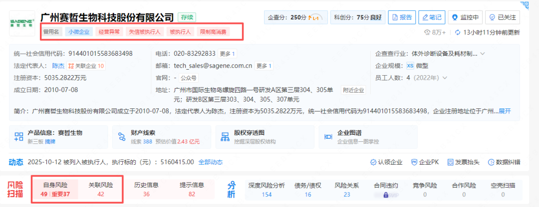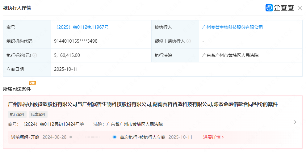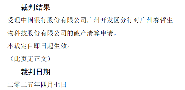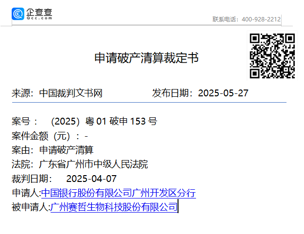 10月11日,9年前新三板上市的IVD明星企业——广州赛哲生物又双叒叕新增了一条被执行信息,执行标的516万! 据企查查网站显示,广州赛哲生物可谓危机重重,自身风险49条,重要风险37条,不乏破产重整,更是早已被列入经营异常、失信被执行人、被执行人、限制高消费等! 据中国裁判文书网显示,中国银行已经对广州赛哲生物的《申请破产清算裁定书》,据裁定书显示,赛哲生物经强制执行,无法清偿到期债务,已具备破产原因。中国银行广州开发区分行作为债权人申请对赛哲公司进行破产清算,其申请符合法律规定,广东省广州市中级人民法院已经受理此次破产清算申请。 裁定书显示
