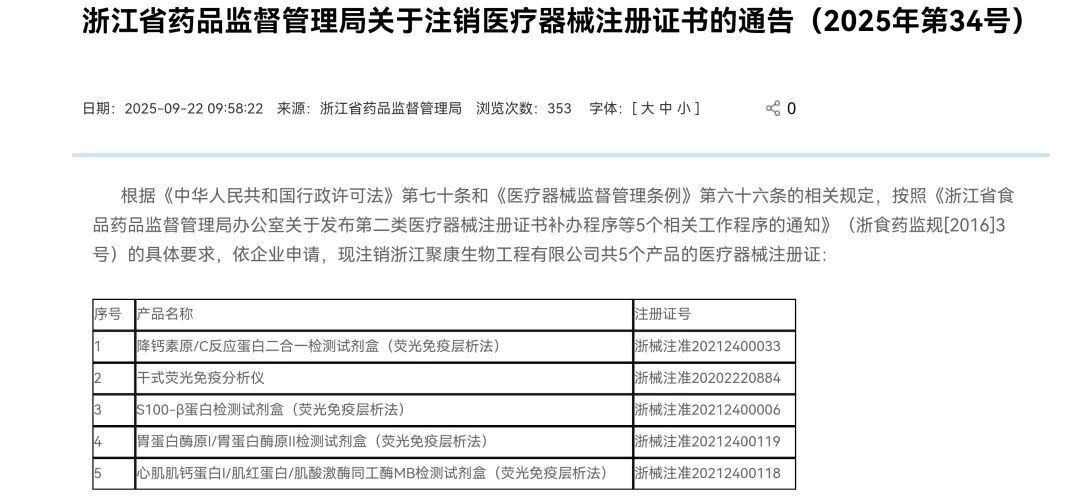 近日,浙江省药监局发布一纸公告,宣布注销浙江聚康生物工程有限公司(以下简称 “聚康生物”)5个荧光免疫检测产品的医疗器械注册证。这是继7月浙江省一次性清理82张生化试剂证照后,年内该省IVD领域第二次“批量退市”。
