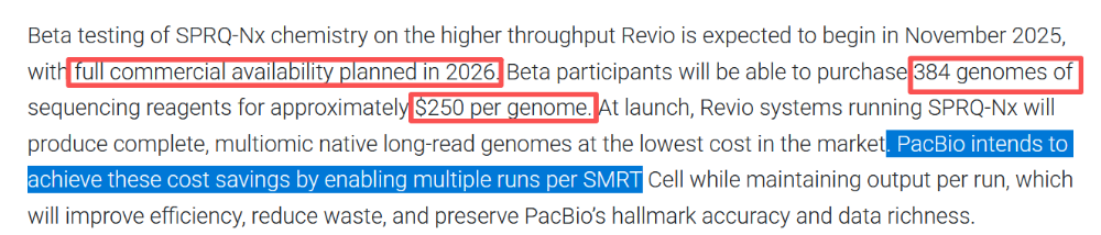 朋友们,真没收PacBio钱...这货最近太能整活了。1、Revio单基因组测序价格将降低到最低250美元,通过SMRT Cell复用技术达成;2、Vega增加 5hmC直测、21 CFR Part 11合规特性和2/4小时快速测序模式,卷临床和制药应用;3、新试剂2025年11月份开启Beta测试,2026年商业化推出。2025年10月14日,PacBio宣布自家的测序试剂又升级了。从原来的SPRQ化学,升级到了SPRQ-Nx ,按我浅薄的理解Nx=Next(这里存疑)。更为关键的是,PacBio把长读长基因组测序的价格打到了300美元以下。呃,甚至Beta测试阶段如果你买384个基因组测序的试剂就能把价格谈到250刀乐。预计2025年11月开启Beta测试,2026年完全商业化推出。正是我们此前多次提到的SMRT Cell reuse技术,这次公告也是确认了这一点。朋友们,你们还记得上次PacBio大幅度调整价格是什么时候么?2025年10月29日,我们跟进了PacBio的大幅度降价将Revio的价格降低到500美元/genome。好家伙,每年降低一半,这让NGS和纳米孔有点难办啊。第一,Vega 5hmC直测支持,也就是5-羟甲基胞嘧啶(5hmC)直测能力加入,增加了PacBio在表观遗传学上的应用优势;第二,Vega增加了 21 CFR Part 11合规特性,也就是说Vega很有可能被用于制药企业的GLP检测当中;第三,Vega增加了2小时和4小时快速测序模式,看来还是是想开临床应用。我们基本能够确定,Revio被安排去卷价格,Vega被安排去卷临床了。这事对华大智造、真迈、赛陆们来说根本就不是事,你们美利坚还在200美元晃荡的时候我们就100美元了。如果,我是说如果,明年PacBio再掀一次桌子,把价格再砍一半。呃,还有个事,这么个降价法,PacBio还有可能是想把Sequel II的客户再逼一逼,赶紧换机器。话说,贝瑞刚不久才给Sequel II上了Dx的户口啊。开盘之后,PacBio的投资人们似乎非常淡定,股价几乎没啥变化...