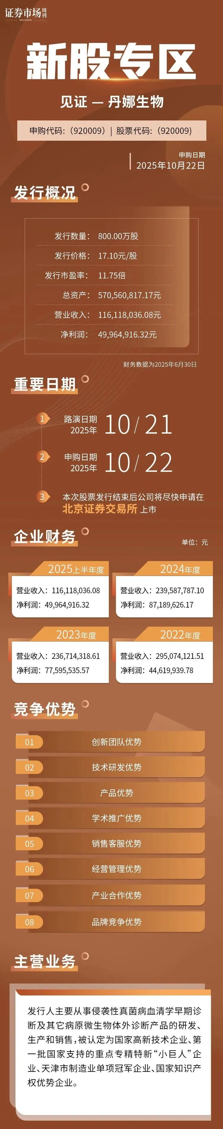 发行概况,丹娜生物本次公开发行800万股,发行价定为17.10元/股,发行市盈率11.75倍。从财务数据看,公司2025年上半年实现营业收入约1.16亿元,净利润近5000万元,尽管较2024年全年数据有所回落,但在当前经济环境下仍显示出较强的盈利能力和成本控制能力。尤其值得注意的是,公司总资产规模达5.7亿元,资产结构稳健,为后续研发与市场拓展奠定了坚实基础。 丹娜生物主营业务聚焦于“侵袭性真菌病血清学早期诊断”及其他病原微生物体外诊断产品的研发、生产和销售。这一定位使其在IVD大领域中切入了相对专业且空白的细分市场——侵袭性真菌感染诊断。 随着全球免疫抑制人群增多(如器官移植、化疗患者)、抗生素滥用问题凸显,侵袭性真菌感染的发病率和死亡率逐年上升,而早期诊断正是临床治疗的难点与关键。丹娜生物凭借其技术积累,成功在这一细分领域形成差异化优势,并先后被认定为国家高新技术企业、重点专精特新“小巨人”企业及天津市制造业单项冠军。 过去几年,IVD行业经历新冠检测需求爆发与回落的大起大落,不少企业面临业绩与估值的双重压力。而在后疫情时代,市场正在重新审视IVD企业的真实竞争力——是否拥有核心技术、是否卡位关键赛道、是否具备持续创新能力。 丹娜生物的上市,可视为一个信号:IVD行业正从“规模扩张”转向“技术深耕”,那些在特定疾病领域形成诊断方案、具备完整产学研链条的企业,将更受资本与政策青睐。 |