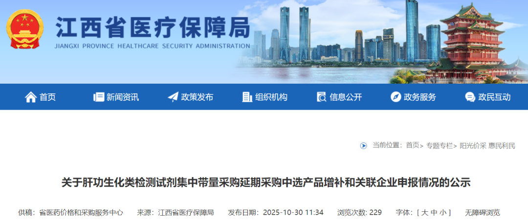 10月30日,江西省医保局发布消息,关于肝功生化类检测试剂集中带量采购延期采购中选产品增补和关联企业申报情况的公示
