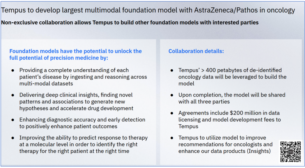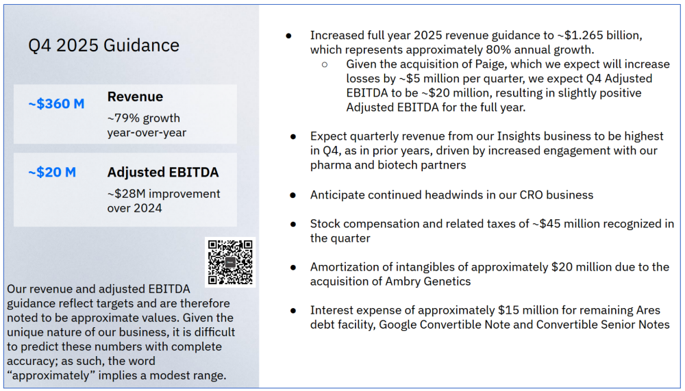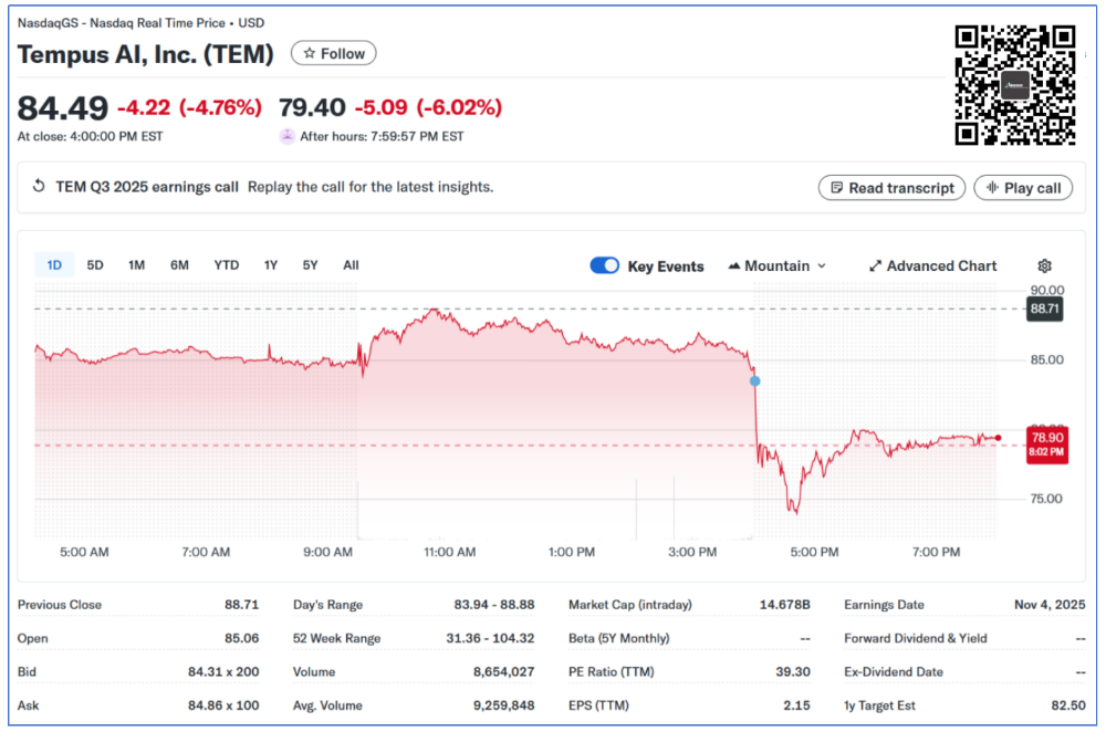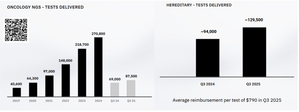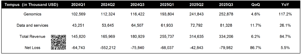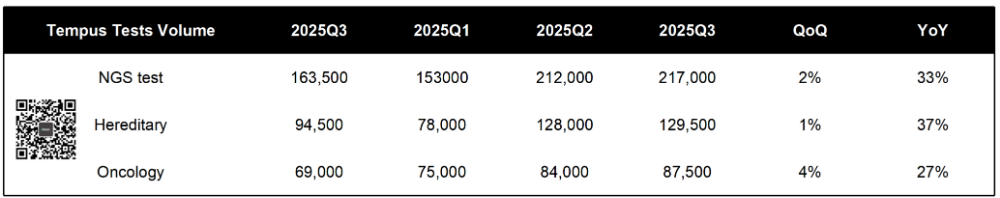 | 2025年11月4日盘后,美国AI概念肿瘤检测公司Tempus AI发布了最新一集财报。我们必须承认的是当天盘后跳水的可不止他这一个,Guardant Health也跳了。那么,Tempus的跳水仅仅是因为市场整个情绪波动吗?我们一起来分拆下Tempus这份2025Q3财报,也许你能得出结论。根据披露的财报,2025Q3 Tempus录得3.342亿美元营收,同比增长84.7%。不过,这个数字也就是略高于2025Q2 Tempus给自己定下的3.3亿美元kpi,稍微拉了点。毛利2.099亿美元,同比增长98.4%,几乎翻倍。考虑到其在2025Q1完成了对Ambry Genetics的并购,同比数据基本可以不看了。从环比上来看,营收增长6.2%,其中来自核心的基因组学业务营收2.53亿美元,环比增长4.6%。而这个数字在Guardant Health那里是14.3%,二者的营收相当,市值也差不多。另外,在排除收购Paige等资本支出后,调整后的EBITA转正了,达到150万美元。2025Q3 Tempus完成了8.75万次肿瘤NGS检测,同比增长27%;因此,我对CEO Eric Levkovsky“Our genomics volume came in super strong”的表述持保留态度。管理层也表示,来自遗传基因检测的增速会继续放缓,同比增速从高2位数,到20%左右的同比增速水平。肿瘤方面,液体活检产品xF计划2025Q4想FDA提交510(k)申请,xR(全转租测序)将以PMA路径向FDA提交申报。MRD方面,除了与Personalis合作的tumor-informed路线产品外,Tempus自研 tumor-naive 产品已上市(CRC)并正在开展 NSCLC 临床研究。不要忘了,Tempus的全名可是叫Tempus AI,他的一项重要但是目前占比不大业务是数据和AI相关业务,也就是Data & Services。根据此前披露的信息,2024年底其在手合同值(TCV)超过9.4亿美元。今年汇总了下,前3个季度也就完成了2.16亿美元的收入。与 AstraZeneca 合作的“foundation model”已完成预训练,预计 2026Q1 推出初版。合同包括2亿美元的数据授权和模型开发费用,如此种种合作Tempus将在2025Q4披露TCV数据,可以期待下。CEO顺便吐槽了下美国医疗体系,“美国医疗支出已高达约 5.7 万亿美元/年且以 7.5% 的速度增长,不可持续”。但是,他的重点是...“要解决这一结构性问题,必须依靠 AI来识别浪费、错误并进行预测性干预。”Tempus预计2025Q4的营收大概还是在3.6亿美元,稍微有点拉。提高了全年的财务指引,营收提高到12.65亿美元,比Q2给出的12.6亿美元略高500万美元。注1:https://investors.tempus.com/news-releases/news-release-details/tempus-reports-third-quarter-2025-results注2:https://investors.tempus.com/static-files/1365a917-96c8-4299-afde-5f0a035b96ff