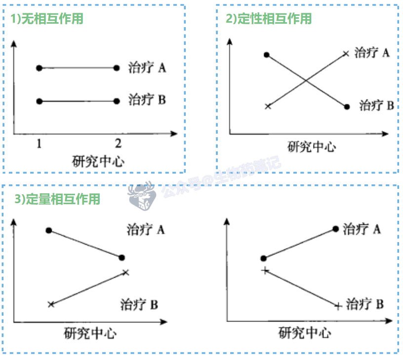 • 定量交互作用(Quantitative interaction):在不同的研究中心,虽然治疗差异的方向可能一致,但是在不同中心之间,治疗差异的程度可能不同。