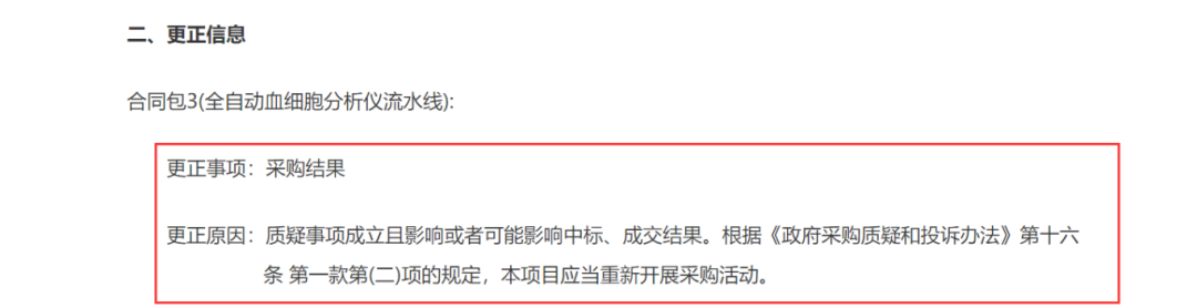 公告显示,全自动血细胞分析仪流水线成功中标,成交金额为0.01元,供应商为漳州片仔癀医疗器械有限公司。 ![]() 8月27日,该项目发布第一次中标公告,公告显示,两家IVD企业的全自动血细胞分析仪流水线以单价为0.01元成交,中标供应商为福建中航技经贸发展有限公司。 ![]() 9月11日,该项目发布结果更正公告。公告指出,合同包3(全自动血细胞分析仪流水线)的采购结果作废,项目重新招标。 废标原因为:质疑事项成立且影响或者可能影响中标、成交结果。 ![]() 质疑内容:
