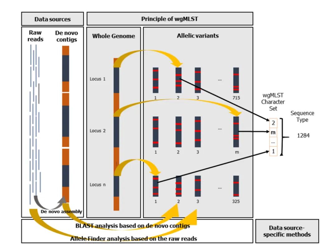 为了分析同一物种内基因组之间的遗传相似性,最初基于7个基因的多位点序列分型方法已扩展到涵盖数百甚至数千个基因位点的核心基因组多位点序列分型(cgMLST)。该方法通过将基因组组装序列与scheme进行比对,从而确定等位基因序列编号。 全基因组多位点序列分型(wgMLST)是cgMLST的进一步延伸,该方法除了使用一组核心基因组位点外,还使用一组辅助基因组位点。实际应用中,通常对cgMLST结果中密切相关的菌株进行wgMLST分析。 单核苷酸多态性(SNP)是通过将测序数据与最相近的参考序列进行比对,基于核心SNP位点构建进化树,鉴定菌株型别。参考基因组的选择对于SNP分析至关重要,可以采用MLST来确定参考序列。 K-mer方法可以克服先验参考基因组和scheme定义的需要。该方法将测序数据分割成特定长度(k)的核苷酸片段。通过比较一组基因组之间K-mer的配对情况,从而评估系统发育相关性。 不同分型技术对于微生物鉴定的分辨率从低到高依次为:MLST-> cgMLST -> wgMLST -> SNP Calling。 CLC Genomics Workbench 将不同分型方法整合到一个可视化平台中,能够高效完成从物种鉴定到溯源分型,大大简化了数据分析工作。 参考文献 Uelze L, Grützke J, Borowiak M, Hammerl JA, Juraschek K, Deneke C, Tausch SH, Malorny B. Typing methods based on whole genome sequencing data. One Health Outlook. 2020 Feb 18. |