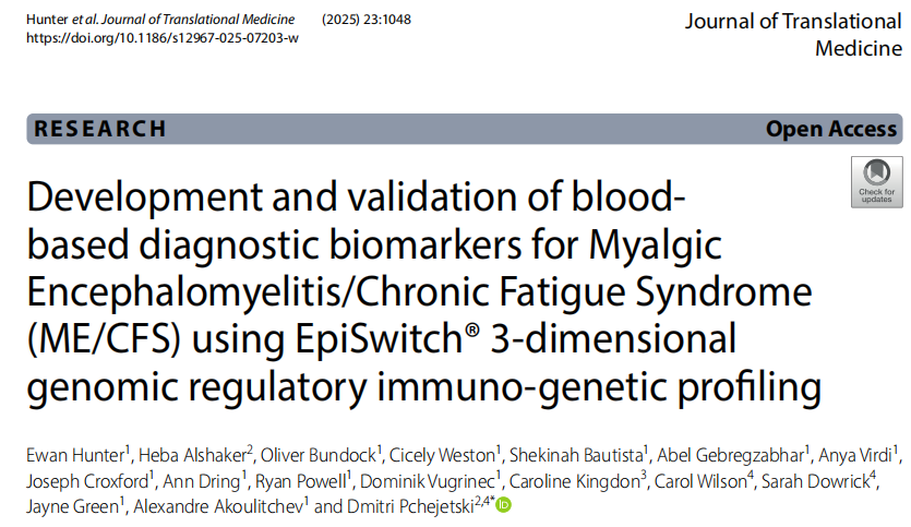 近日,杂志Journal of Translational Medicine上发表了一篇题为“Development and validation of bloodbased diagnostic biomarkers for Myalgic Encephalomyelitis/Chronic Fatigue Syndrome  (ME/CFS) using EpiSwitch® 3-dimensional genomic regulatory immuno-genetic profiling”的文章。作者为东英吉利大学与牛津生物动力学公司。本研究基于EpiSwitch®三维基因组调控免疫遗传分析技术,通过全基因组染色体构象(CCs)筛选,确定了一个200个标记的ME/CFS诊断模型(Episwitch®CFS测试),灵敏度为92%,特异性为98%。通路分析揭示了几个可能导至ME/CFS病理的因素,包括白细胞介素、TNFα、神经炎症通路、toll样受体信号传导和JAK/STAT。与利妥昔单抗和醋酸格拉替雷(Copaxone)(具有ME/CFS治疗潜力的疗法)作用的途径进行比较,发现IL2是具有明确患者聚类的共享途径,表明可能存在靶向治疗的潜在应答组。