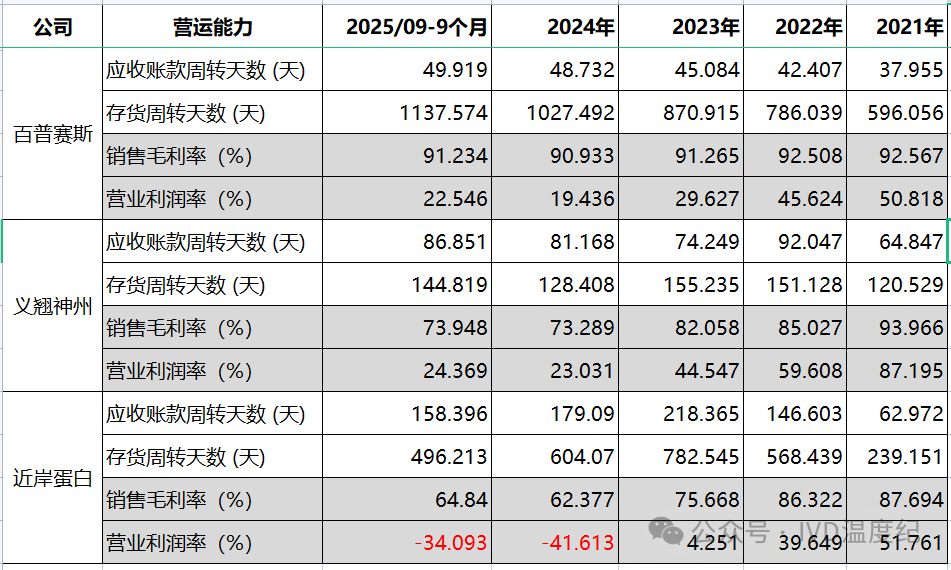 这一对比,就很明显,百普赛斯应收账款管理最优秀只有不到50天(非常优秀),但存货周转压力应该是最大的,达到了1137天(有点猛啊!);义翘神州中规中矩吧,应收账款周期大概是86天,存货周转天数大概是144天;近岸蛋白应收账款达到了158天,存货周转也接近500天……相对来说,近岸蛋白确实不如两家友商。