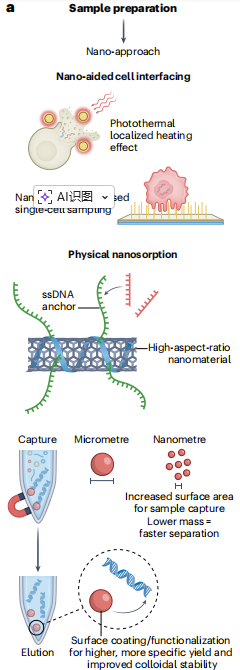 纳米材料还可能使采样方法更加非侵入性,并实现连续的单细胞监测,比如,石墨烯纳米片涂层的微针结合dCas9,可用于监测体液中的cfDNA。单链DNA功能化的碳纳米管凭借其高比表面积,可实现对病毒RNA的高效提取。磁性微珠已经用来捕获核酸靶标,但纳米级磁珠的开发有望通过更快的分离速度和更高表面活性,进一步提升诊断效率(下图a)。