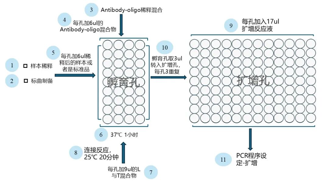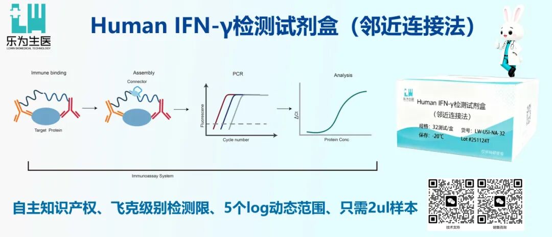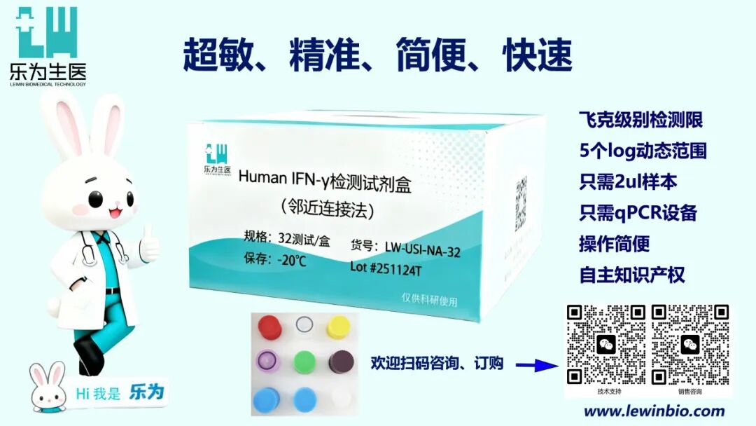 杭州乐为生医科技有限公司重磅推出 Human IFN-γ检测试剂盒(邻近连接法),专为人血清、血浆、细胞培养上清中IFN-γ蛋白的高灵敏度定量检测而设计,其核心技术已获得多项国家发明专利授权。适用于科研场景,助力免疫研究、疾病机制探索与药物开发! IFN-γ(γ-干扰素) 是连接先天性与适应性免疫的枢纽。在肿瘤免疫、自身免疫性疾病、感染性疾病(如结核)等研究领域,其表达水平是衡量特异性免疫应答强度的黄金指标。精准检测IFN-γ,对于揭示疾病机制、评估药物疗效至关重要。 技术原理 本试剂盒基于邻位连接技术,其核心原理在于将抗体-抗原结合的高度特异性与核酸扩增的超高灵敏度相结合。 当一对分别偶联了特异寡核苷酸链的特异性抗体与靶标 IFN-γ 同时结合时, 其携带的寡核苷酸在空间上彼此邻近。 通过引入一条夹板探针, 其两端分别与这两条寡核苷酸的末端进行特异性杂交, 从而稳定地引导二者形成首尾相接的拓扑结构。 在连接酶的作用下, 两条寡核苷酸共价连接成一个完整的、 可扩增的 DNA 模板。 最终, 通过对该特异性 DNA 模板进行 qPCR 定量扩增, 将初始的蛋白结合信号转化为指数级放大的荧光信号, 实现对 IFN-γ 的精准超敏定量。 产品信息 产品名称:Human IFN-γ检测试剂盒(邻近连接法) 货号:LW-USI-NA-32 规格:32测试/盒 适用样本:人血清、血浆、细胞培养上清 适用仪器:宏石96S、ABI 7500、Bio-Rad CFX96等 操作流程如图 样本预处理:10倍稀释样本 标准曲线制备:8个浓度点,覆盖动态范围宽。 Antibody-oligo稀释 孵育:37℃孵育1小时 连接反应:室温20分钟 qPCR扩增:40个循环,60秒延伸,快速出结果。 结果展示 配套USI-NA分析软件,自动绘制标准曲线,计算样本浓度,结果直观可靠,确保数据准确性。 产品亮点 超高灵敏度:抗体-抗原结合的高度特异性与核酸扩增的超高灵敏度相结合,实现fg/mL级别检测 精准定量:采用qPCR信号输出,线性范围宽,重复性好 操作简便:预混试剂,操作简便,步骤清晰,兼容常见qPCR仪器 稳定可靠:-20℃保存,有效期长达12个月 样本测试 不同浓度血浆样本测试验证结果 为验证试剂盒的检测性能,我们测试了低、中、高一系列梯度浓度的样本。结果表明,试剂盒能够对不同浓度样本实现清晰、准确的区分,各浓度组间信号强度差异显著,展现了优异的区分能力与定量性能。 探秘微观,引领生命科技前沿!杭州乐为生医科技有限公司是一家以超灵敏免疫检测为核心,集原料修饰、试剂盒开发、仪器软件研发、生产、销售于一体的整体解决方案提供商。 杭州乐为生医科技有限公司,精心打造多款科研利器: