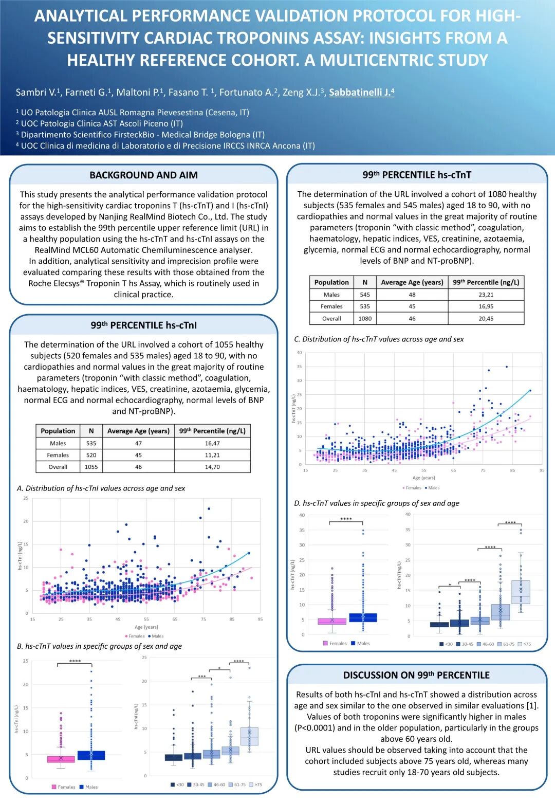 结果显示,hs-cTnT的总体第99百分位参考上限值(URL)为20.45 ng/L(女性16.95 ng/L,男性23.21 ng/L),hs-cTnI的总体URL为14.70 ng/L(女性11.21 ng/L,男性16.47 ng/L)。